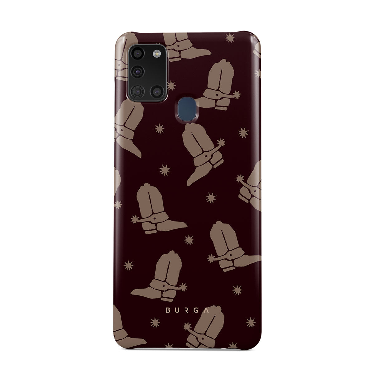 Say Howdy to this charming Samsung Galaxy A21s 4G phone case design. Cowboy boots and stars dance across a deep brown background, celebrating the essence of western life. Perfect for those who embrace their free spirit.