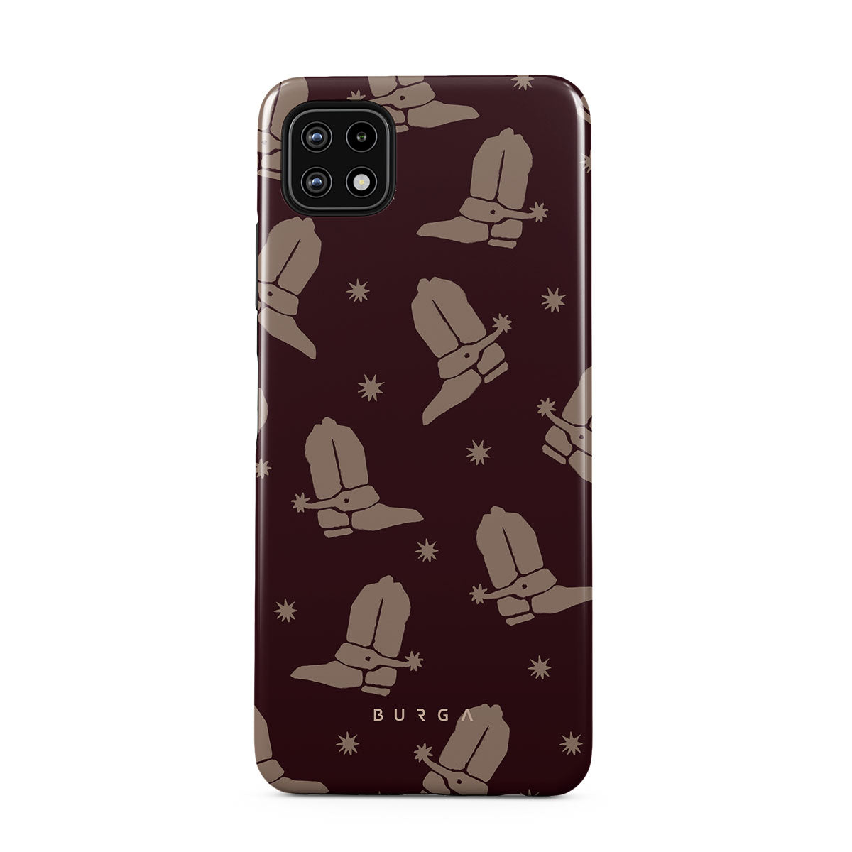 Say Howdy to this charming Samsung Galaxy A22 5G phone case design. Cowboy boots and stars dance across a deep brown background, celebrating the essence of western life. Perfect for those who embrace their free spirit.