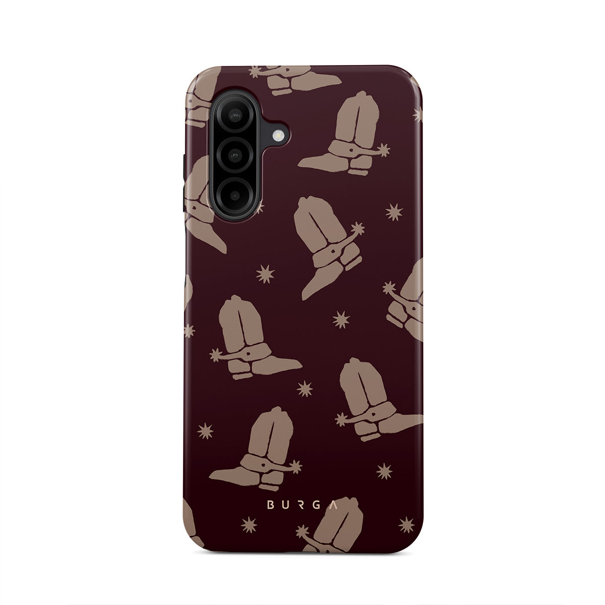 Say Howdy to this charming Samsung Galaxy A26 5G phone case design. Cowboy boots and stars dance across a deep brown background, celebrating the essence of western life. Perfect for those who embrace their free spirit.