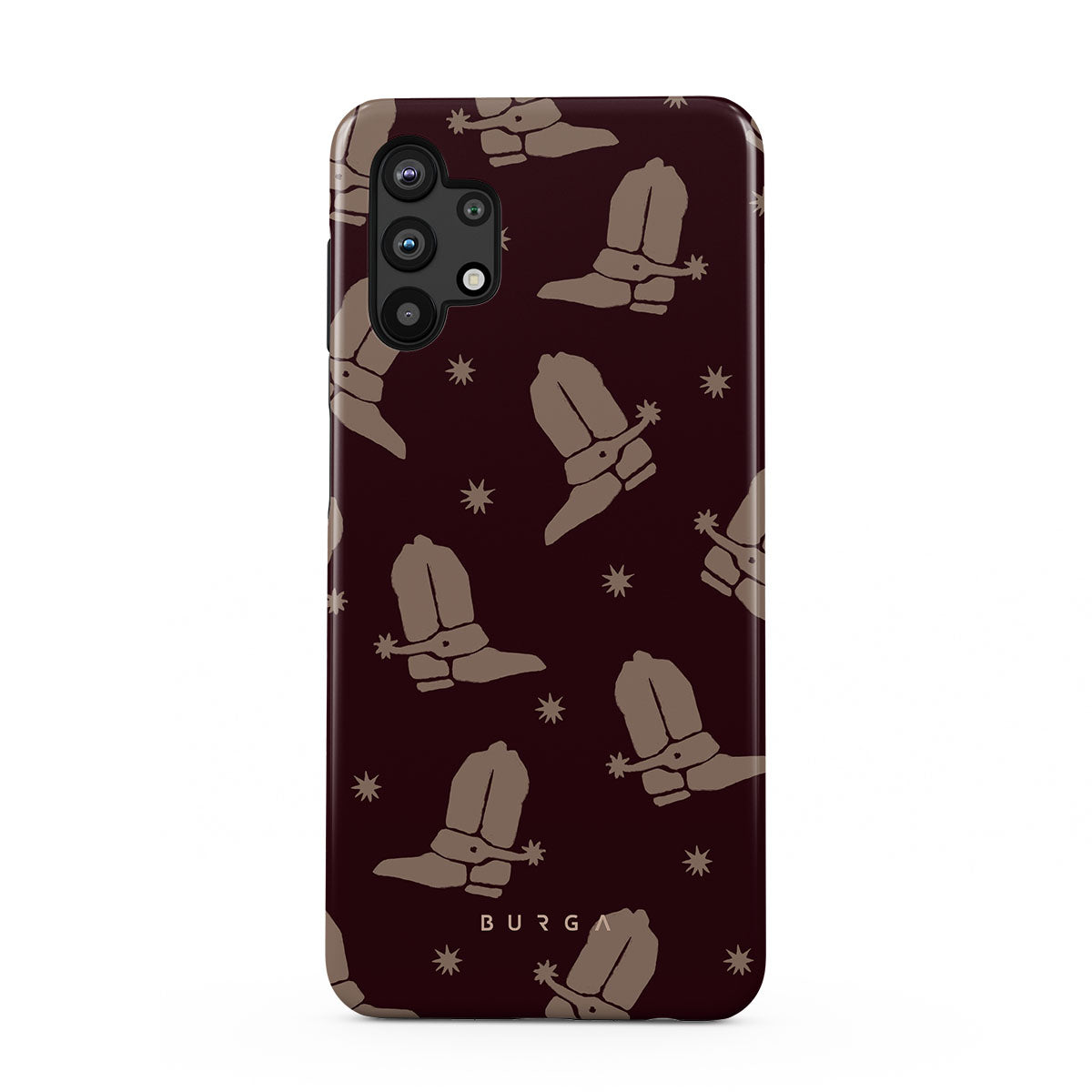 Say Howdy to this charming Samsung Galaxy A32 5G phone case design. Cowboy boots and stars dance across a deep brown background, celebrating the essence of western life. Perfect for those who embrace their free spirit.