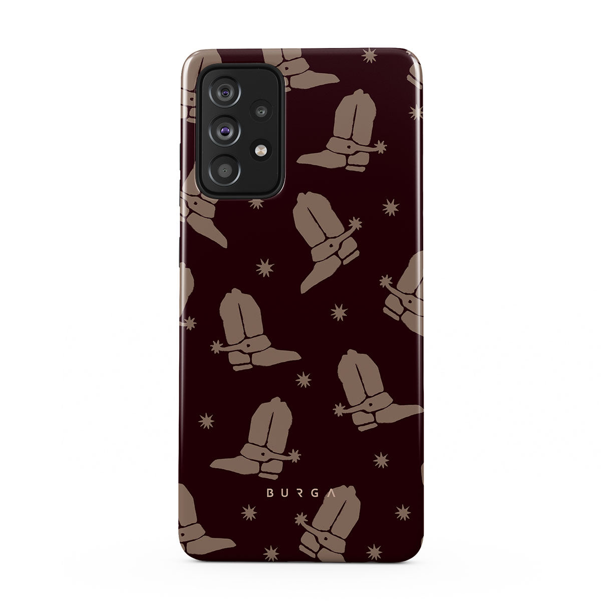 Say Howdy to this charming Samsung Galaxy A52 / A52S 4G / 5G phone case design. Cowboy boots and stars dance across a deep brown background, celebrating the essence of western life. Perfect for those who embrace their free spirit.