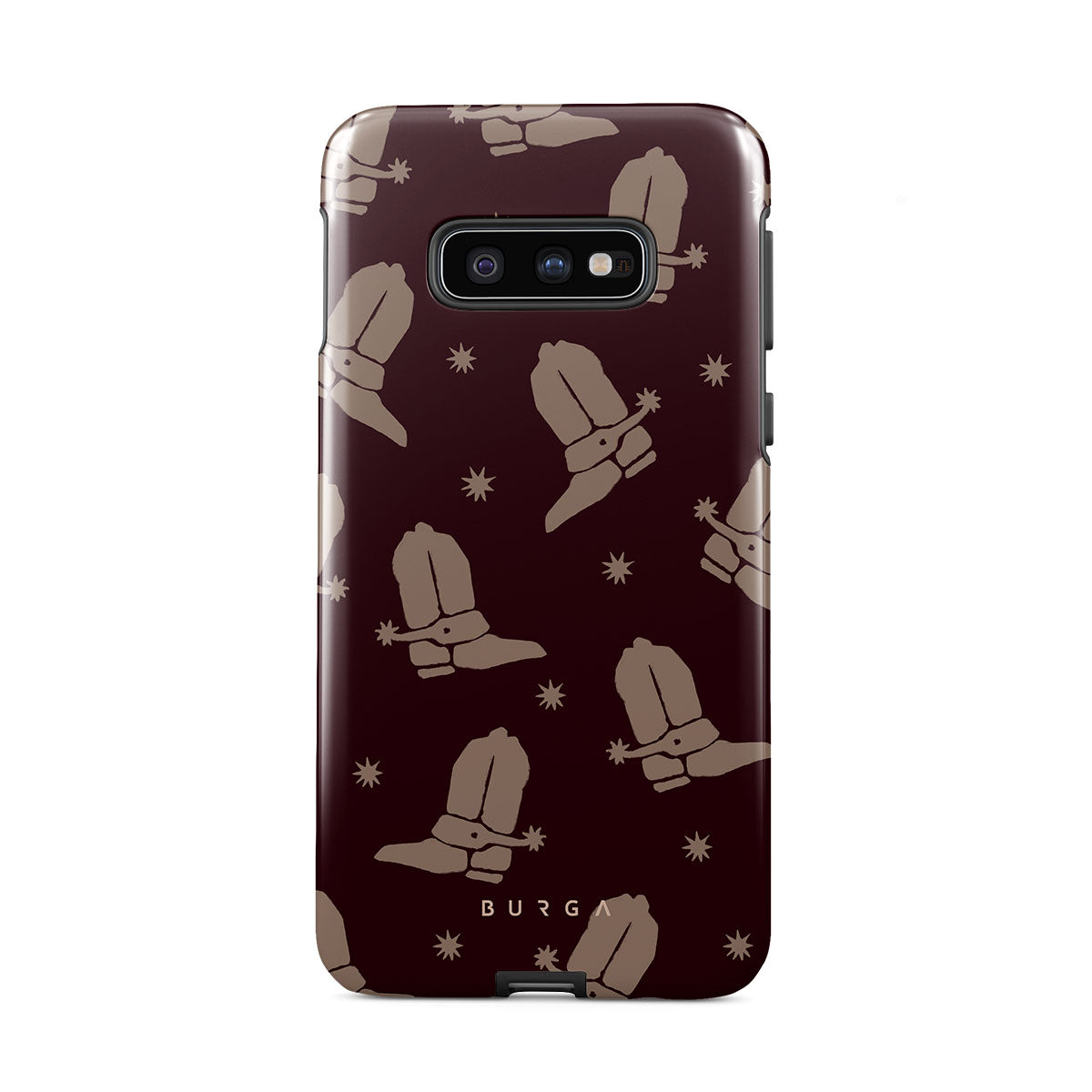 Say Howdy to this charming Samsung Galaxy S10E phone case design. Cowboy boots and stars dance across a deep brown background, celebrating the essence of western life. Perfect for those who embrace their free spirit.