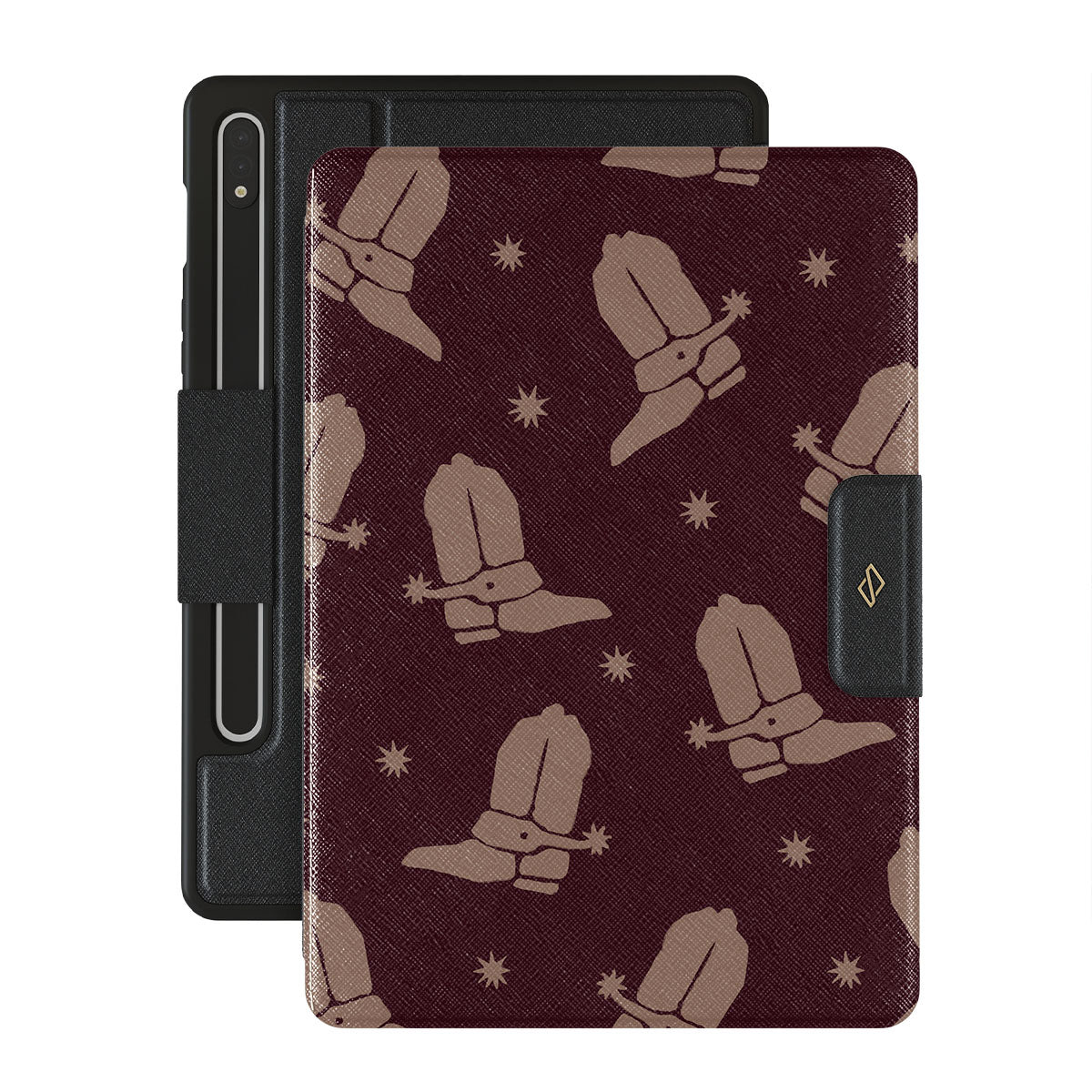 Say Howdy to this charming Samsung Galaxy Tab S9 FE folio case design. Cowboy boots and stars dance across a deep brown background, celebrating the essence of western life. Perfect for those who embrace their free spirit.