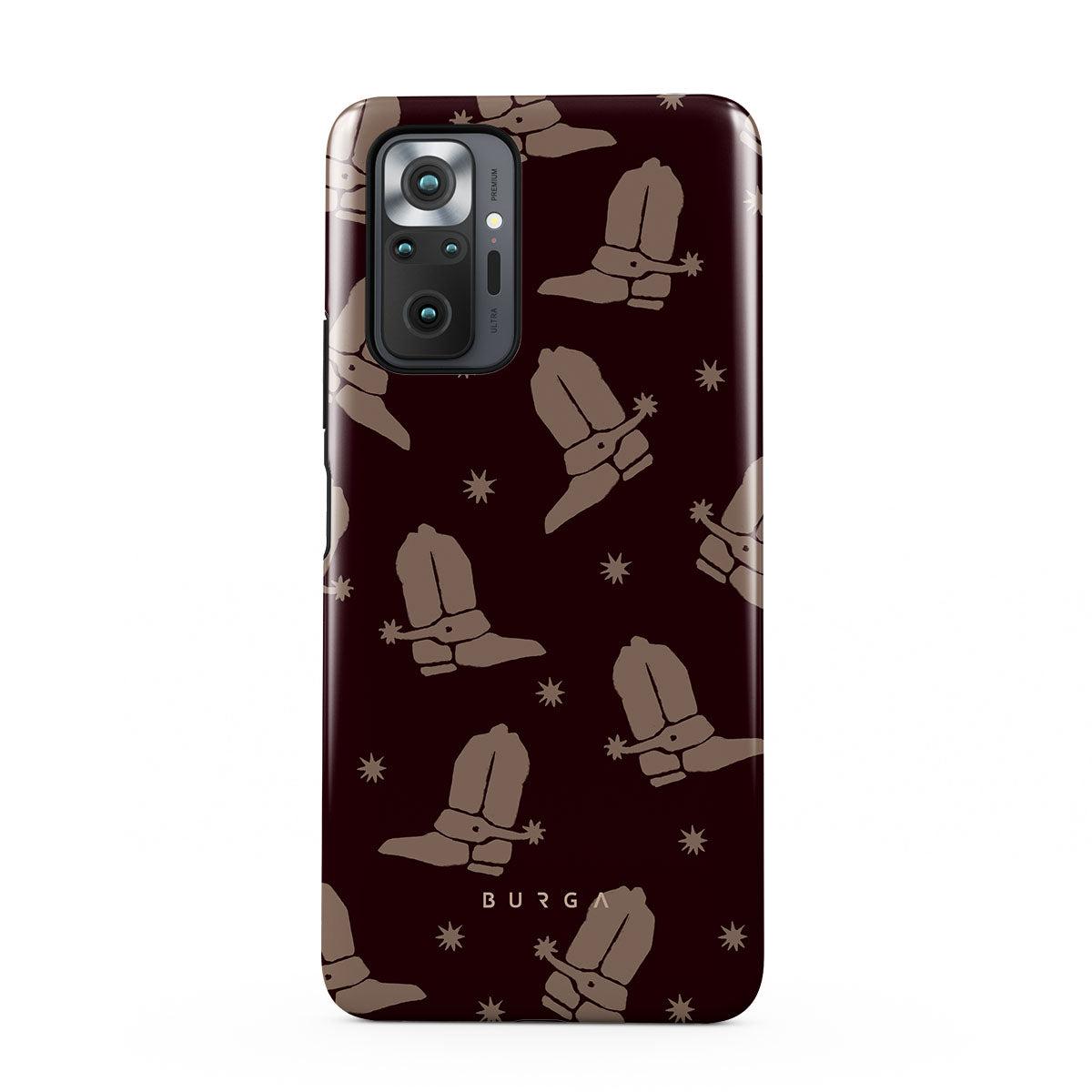 Say Howdy to this charming Xiaomi Redmi Note 10 Pro phone case design. Cowboy boots and stars dance across a deep brown background, celebrating the essence of western life. Perfect for those who embrace their free spirit.
