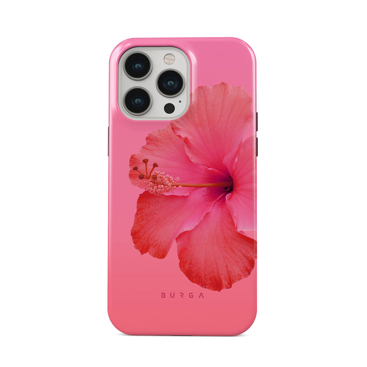 Our Island Girl iPhone 13 Pro Max phone case design bursts with the fiery red of a hibiscus in full bloom against a dreamy pink backdrop. Perfect for those who embody the spirit of a sun-kissed island retreat.