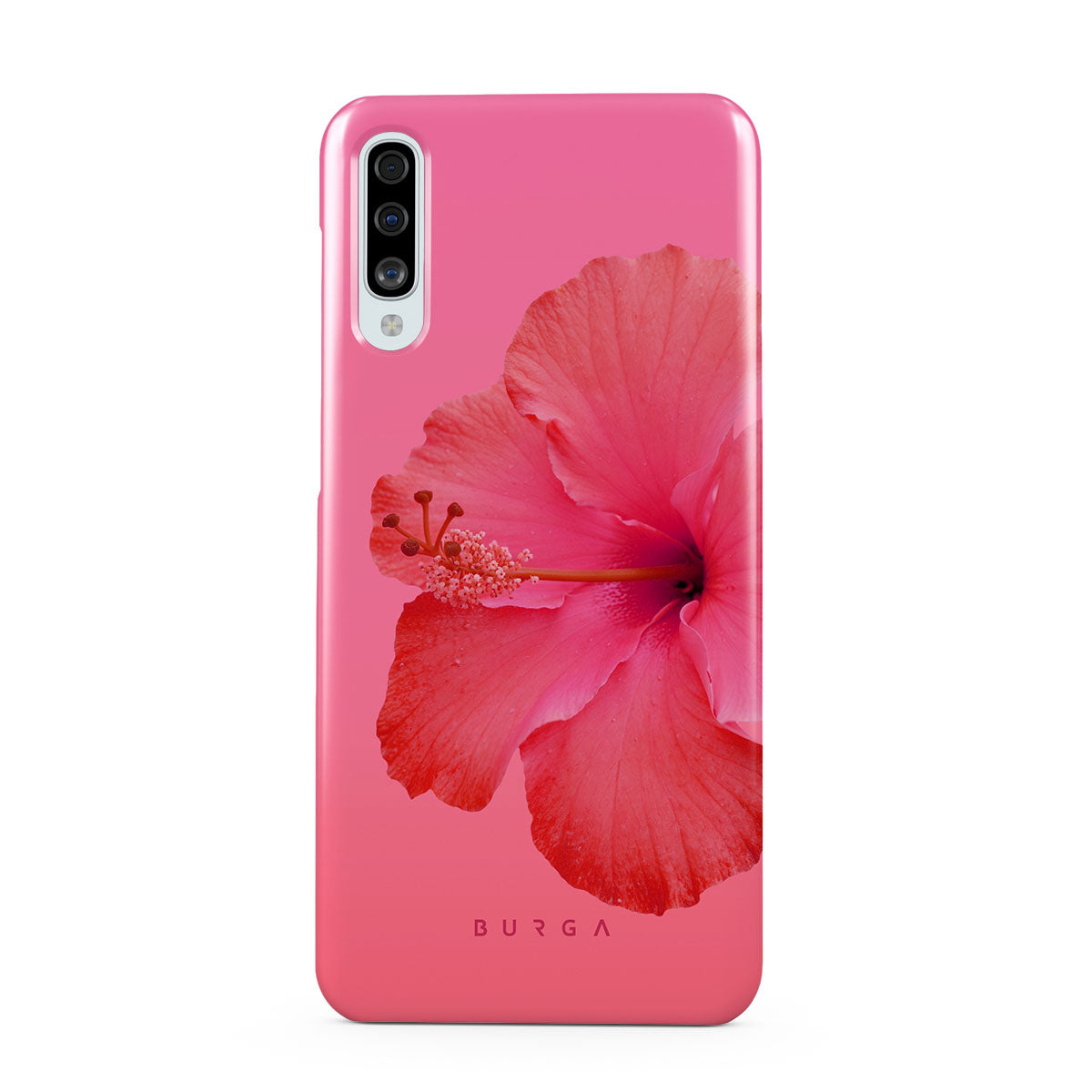 Our Island Girl Samsung Galaxy A50 phone case design bursts with the fiery red of a hibiscus in full bloom against a dreamy pink backdrop. Perfect for those who embody the spirit of a sun-kissed island retreat.