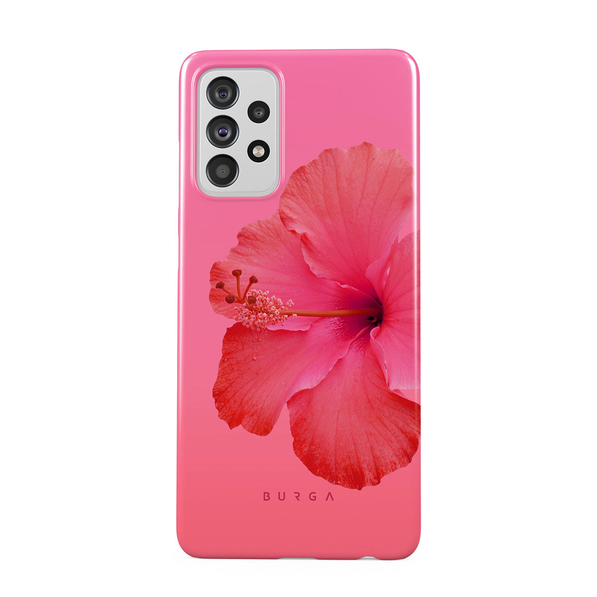 Our Island Girl Samsung Galaxy A72 4G / 5G phone case design bursts with the fiery red of a hibiscus in full bloom against a dreamy pink backdrop. Perfect for those who embody the spirit of a sun-kissed island retreat.