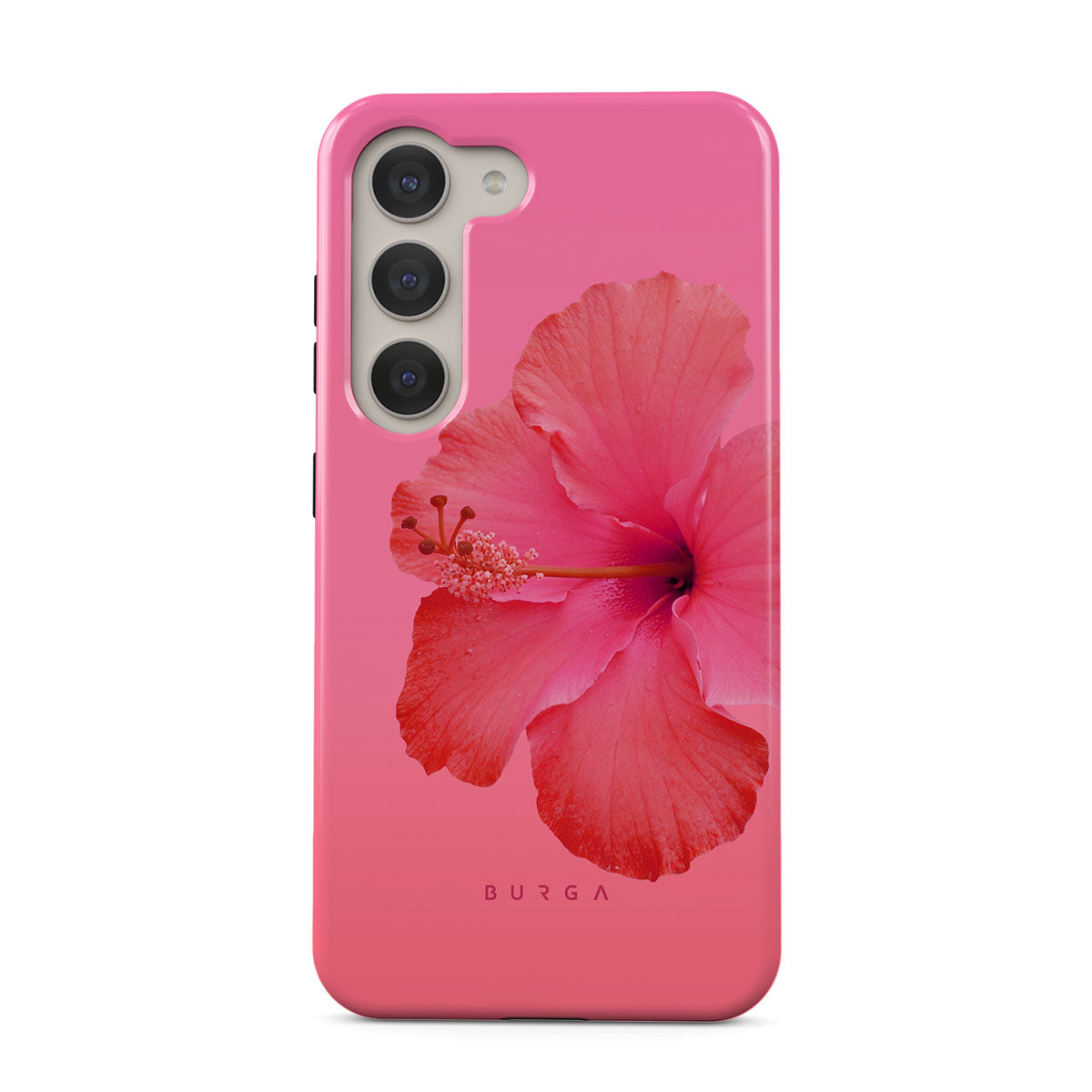 Our Island Girl Samsung Galaxy S23 phone case design bursts with the fiery red of a hibiscus in full bloom against a dreamy pink backdrop. Perfect for those who embody the spirit of a sun-kissed island retreat.