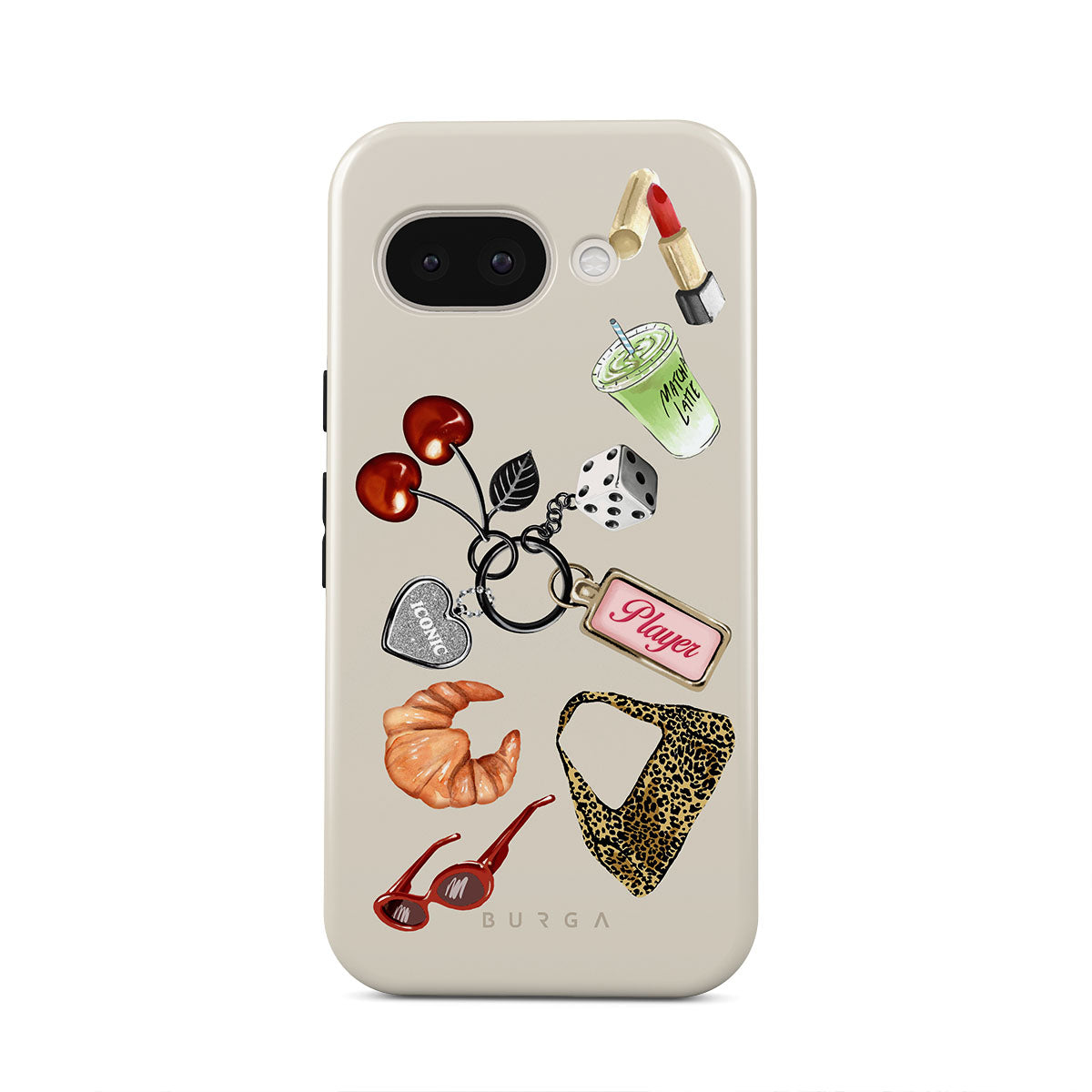 This design features: red sunglasses, red lipstick, green matcha drink, croissant, black dice, leopard-print bag, keychain with silver heart, cherries, dice and "Player" tag