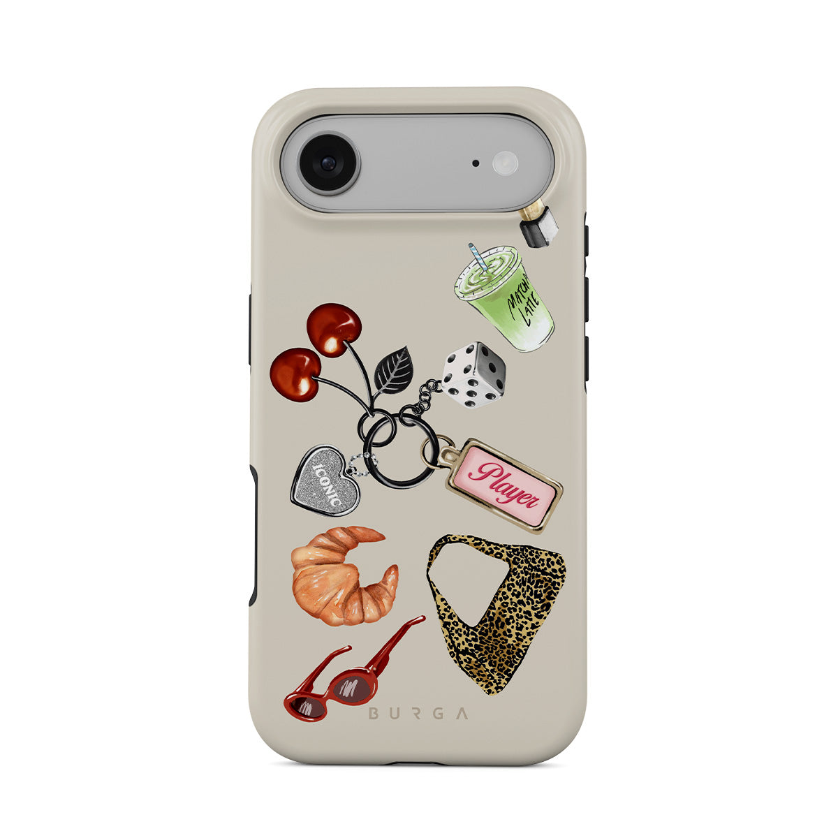 This design features: red sunglasses, red lipstick, green matcha drink, croissant, black dice, leopard-print bag, keychain with silver heart, cherries, dice and "Player" tag