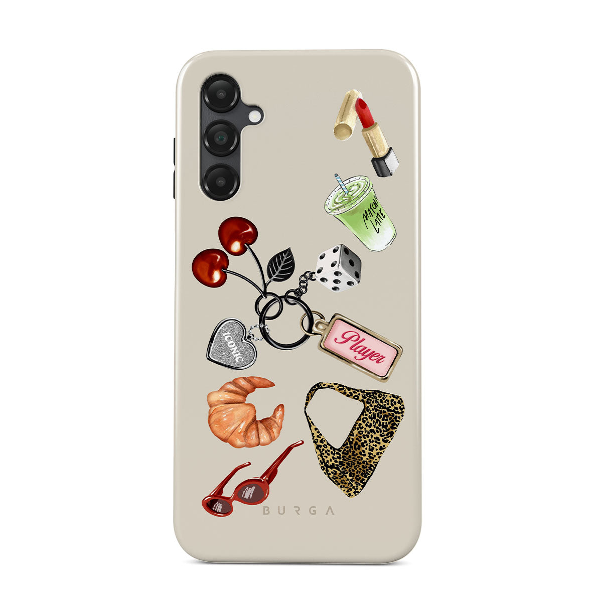 This design features: red sunglasses, red lipstick, green matcha drink, croissant, black dice, leopard-print bag, keychain with silver heart, cherries, dice and "Player" tag