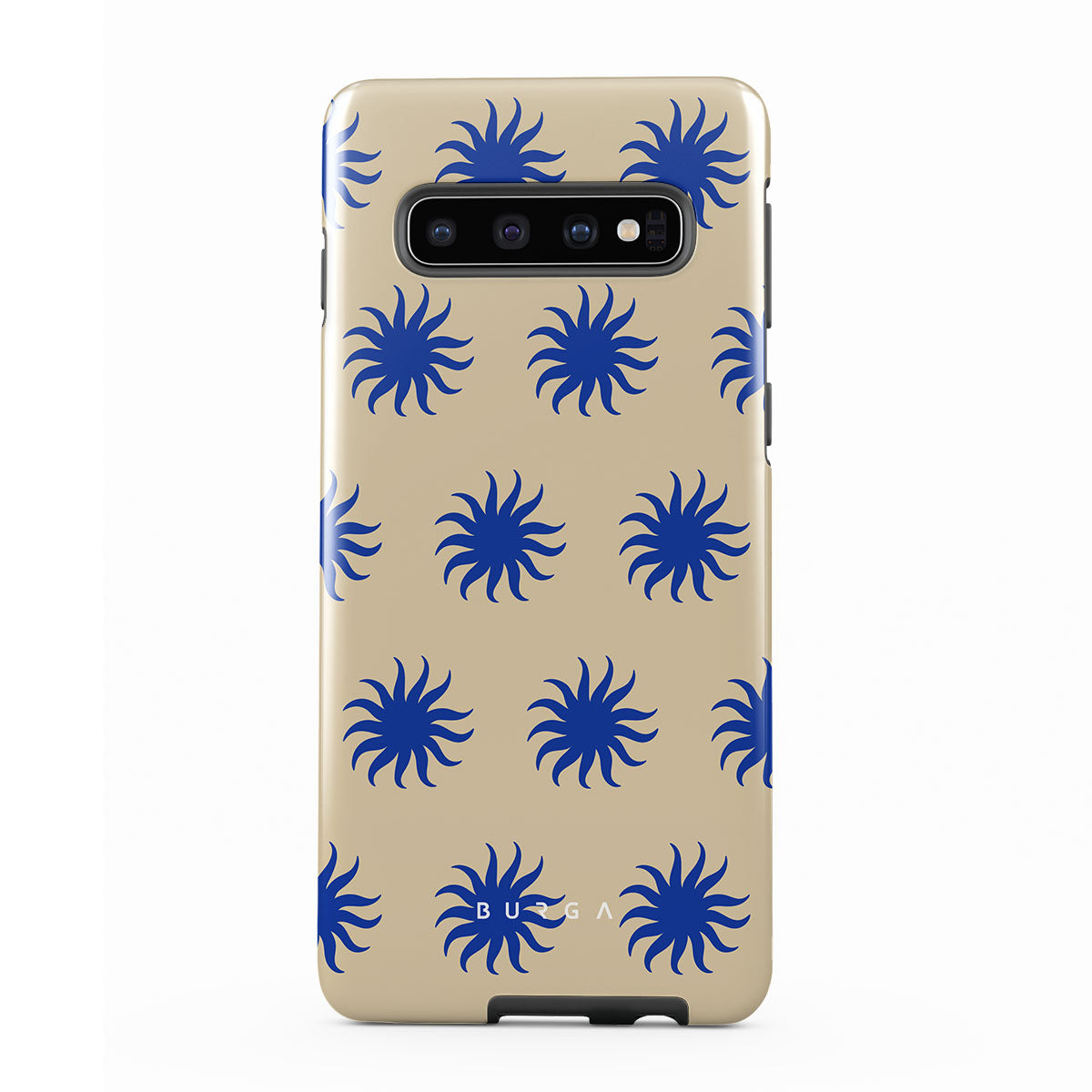 Immerse yourself in the vibrant spirit of the tropics with our La Playa Samsung Galaxy S10 4G phone case. This design boasts a warm, sandy beige base highlighted by striking blue motifs, reminiscent of the breezy Caribbean islands. It’s a stylish celebration of coastal beauty.