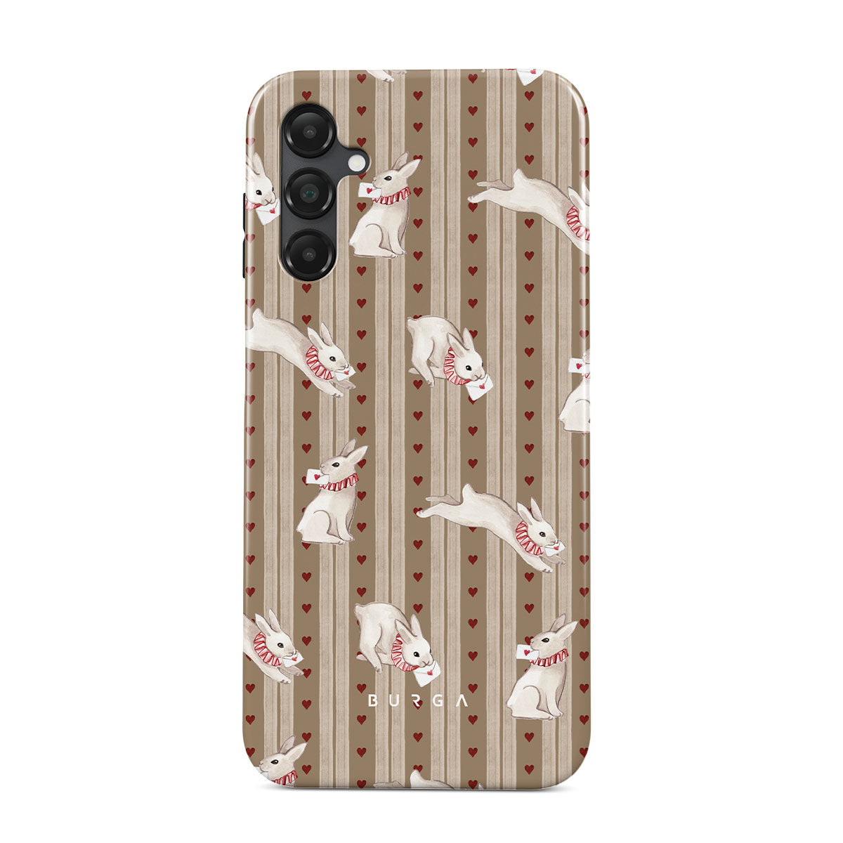 The Late Again Samsung Galaxy A25 phone case design is a love letter lost in time—scattered hearts, hurried notes, and white rabbits racing against a clock that refuses to be tamed. Sent, but never received. Read, but never answered. Always running, always chasing, always just a moment too late.