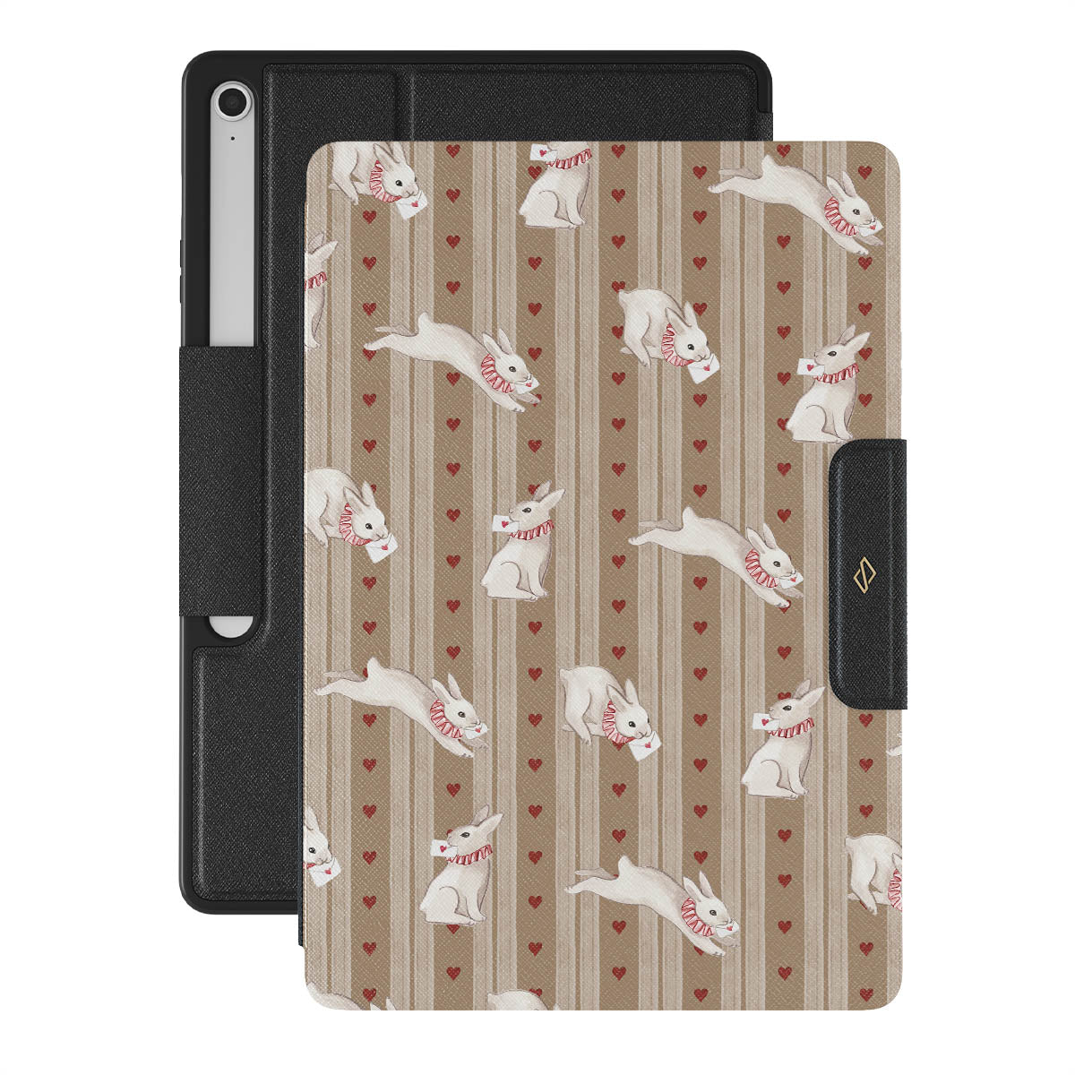 The Late Again Samsung Galaxy Tab S10+ FE folio case design is a love letter lost in time—scattered hearts, hurried notes, and white rabbits racing against a clock that refuses to be tamed. Sent, but never received. Read, but never answered. Always running, always chasing, always just a moment too late.