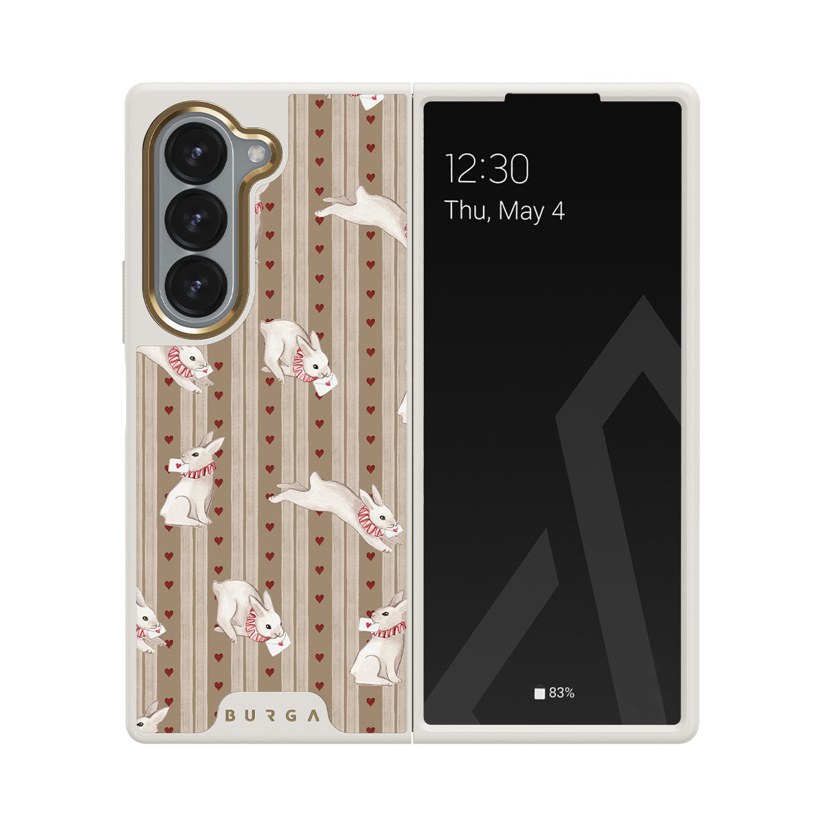 The Late Again Samsung Galaxy Z Fold 6 phone case design is a love letter lost in time—scattered hearts, hurried notes, and white rabbits racing against a clock that refuses to be tamed. Sent, but never received. Read, but never answered. Always running, always chasing, always just a moment too late.
