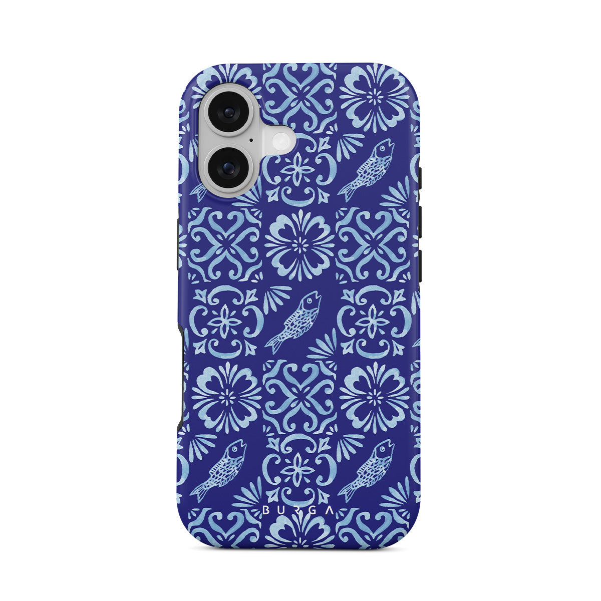 This design features: Portuguese tile patterns, deep blues, floral patterns, flowers, fish