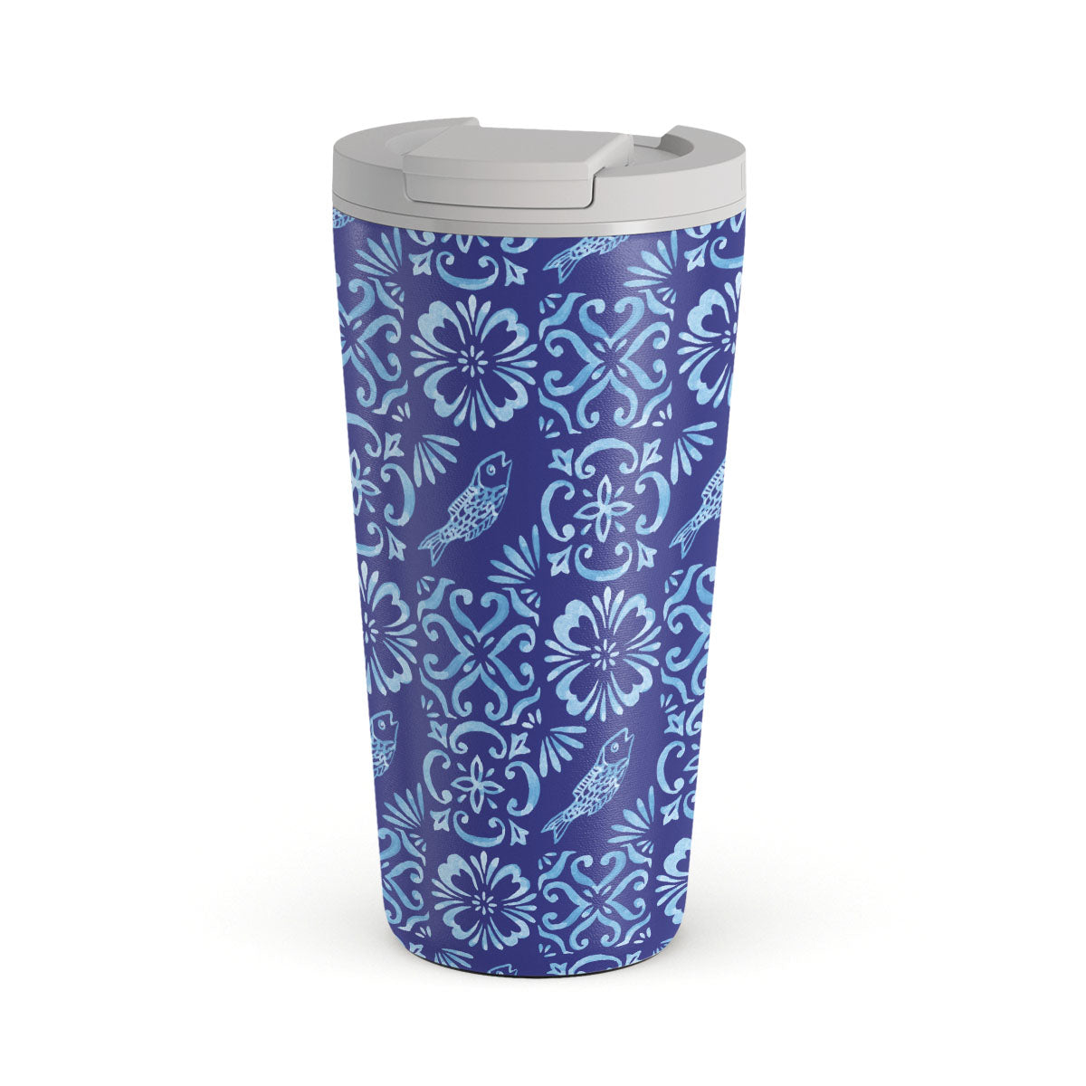 This design features: Portuguese tile patterns, deep blues, floral patterns, flowers, fish