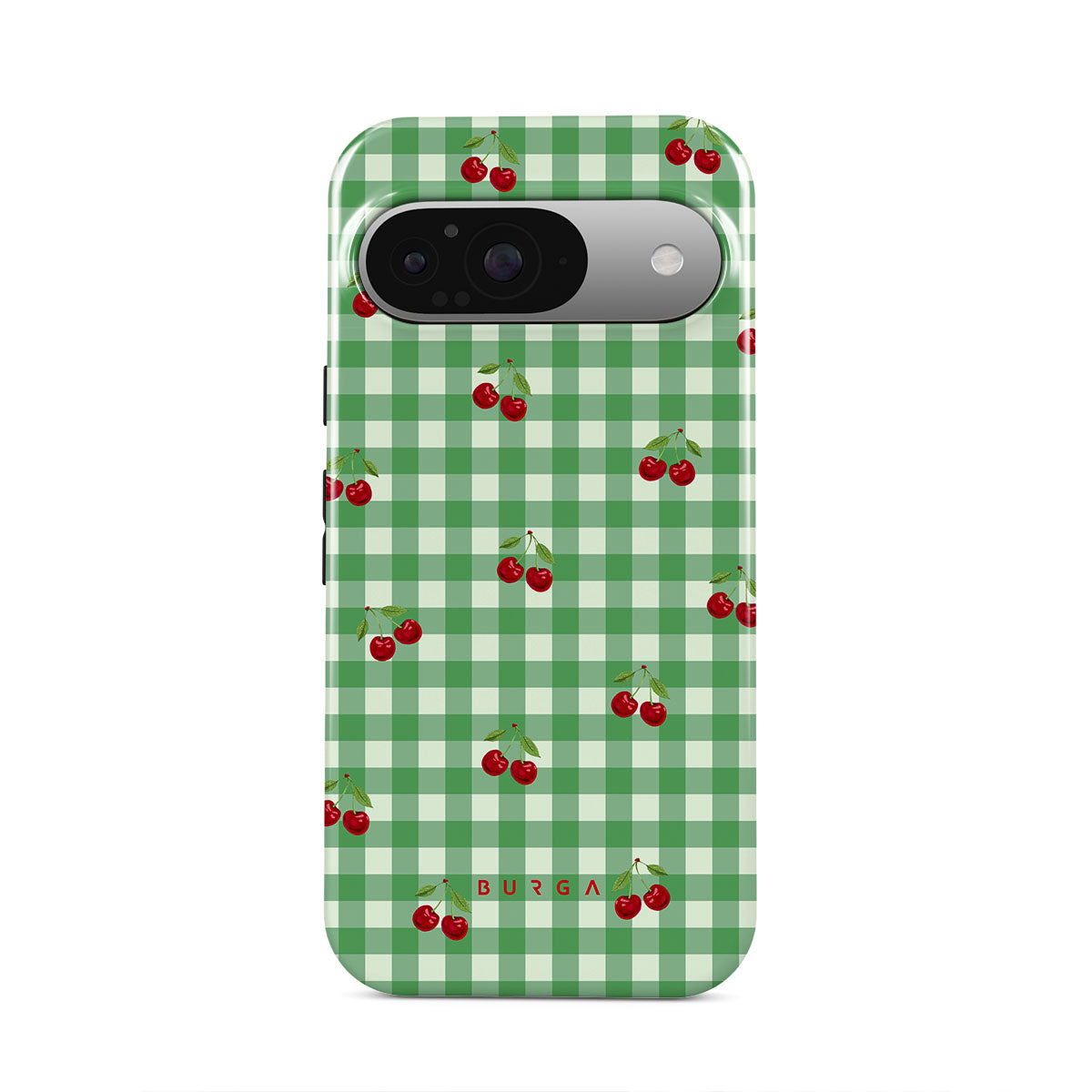 The Little Life Google Pixel 9 phone case design: green checks, simple and true, like a patch of grass under a tree, where you can sit and watch the small world go by, every leaf a chapter in nature’s story.