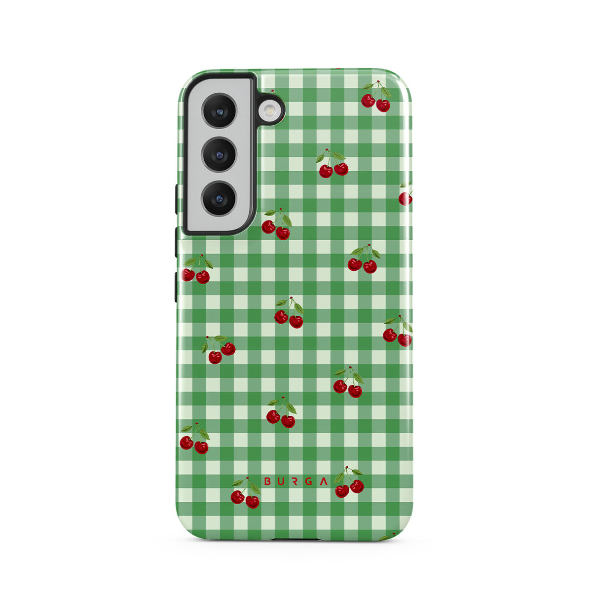 The Little Life Samsung Galaxy S22 Plus phone case design: green checks, simple and true, like a patch of grass under a tree, where you can sit and watch the small world go by, every leaf a chapter in nature’s story.