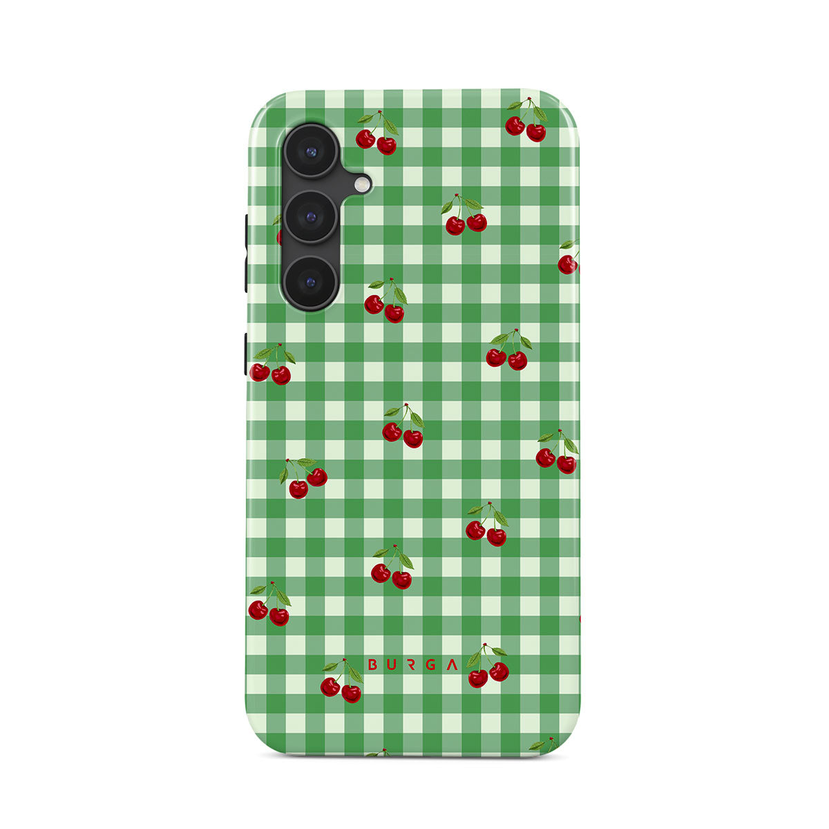 The Little Life Samsung Galaxy S23 FE phone case design: green checks, simple and true, like a patch of grass under a tree, where you can sit and watch the small world go by, every leaf a chapter in nature’s story.
