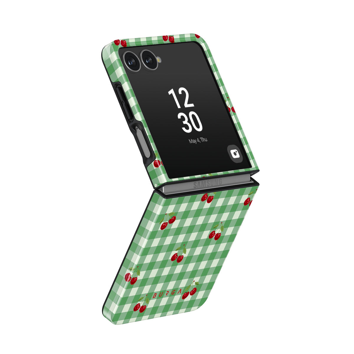 The Little Life Samsung Galaxy Z Flip 7 phone case design: green checks, simple and true, like a patch of grass under a tree, where you can sit and watch the small world go by, every leaf a chapter in nature’s story.