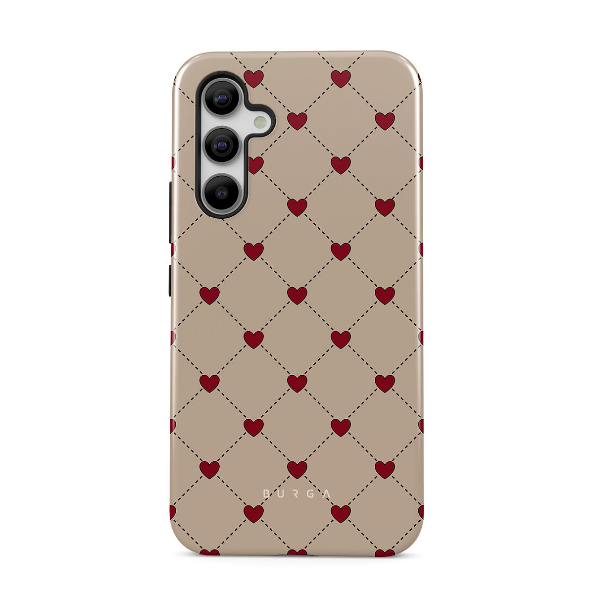 Secrets of the heart whispered between elegant beige diamonds. Every moment, a red heart shimmers—a hidden message, a silent wish, a love letter to the beholder. Discover our Love Letter Samsung Galaxy A54 Case phone case design.