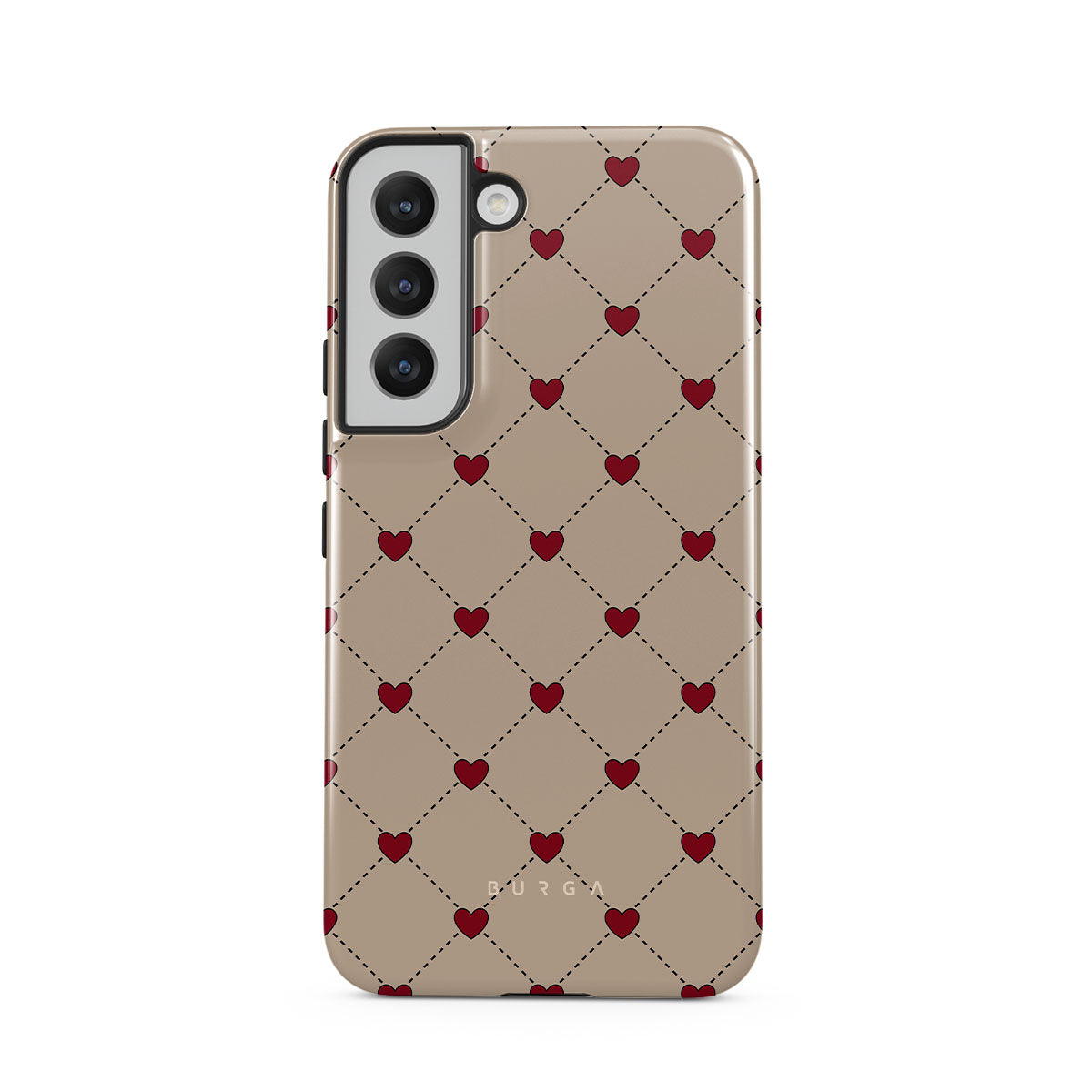Secrets of the heart whispered between elegant beige diamonds. Every moment, a red heart shimmers—a hidden message, a silent wish, a love letter to the beholder. Discover our Love Letter Samsung Galaxy S22 Case phone case design.