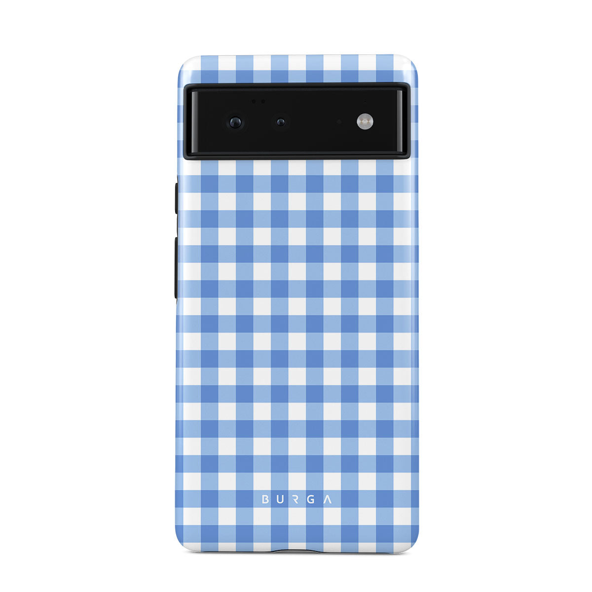Crisp blue checks are your invitation to lay on the grass, look up at the sky, and find shapes in the clouds—simple joys that make any day lovely. That’s our Lovely Day Google Pixel 6 phone case design.