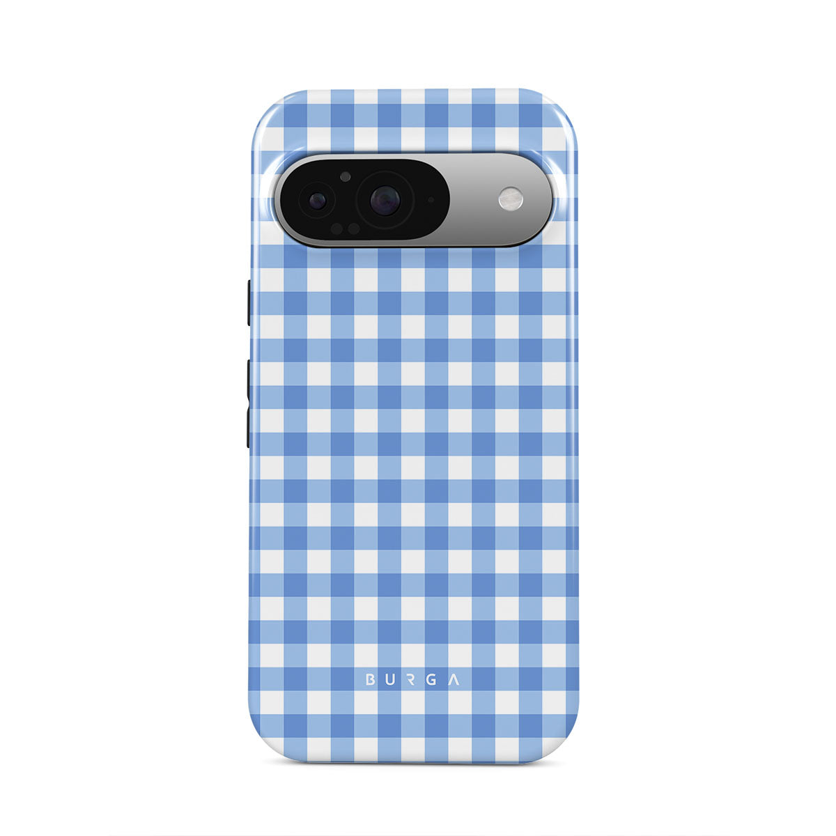 Crisp blue checks are your invitation to lay on the grass, look up at the sky, and find shapes in the clouds—simple joys that make any day lovely. That’s our Lovely Day Google Pixel 9 phone case design.