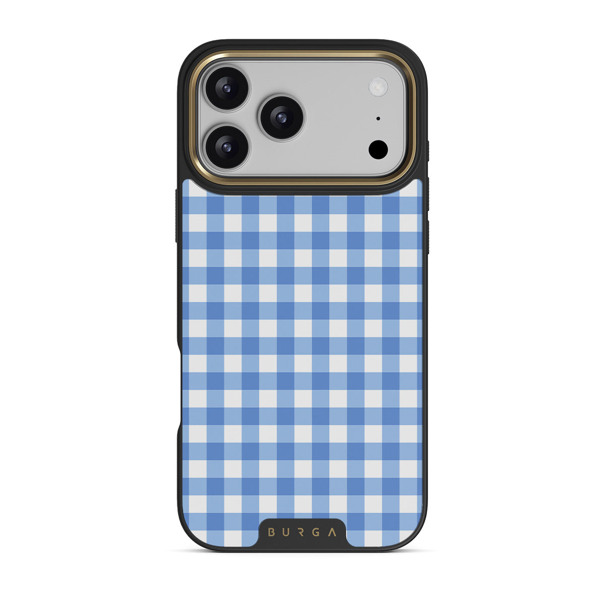 Crisp blue checks are your invitation to lay on the grass, look up at the sky, and find shapes in the clouds—simple joys that make any day lovely. That’s our Lovely Day iPhone 17 Pro Max phone case design.