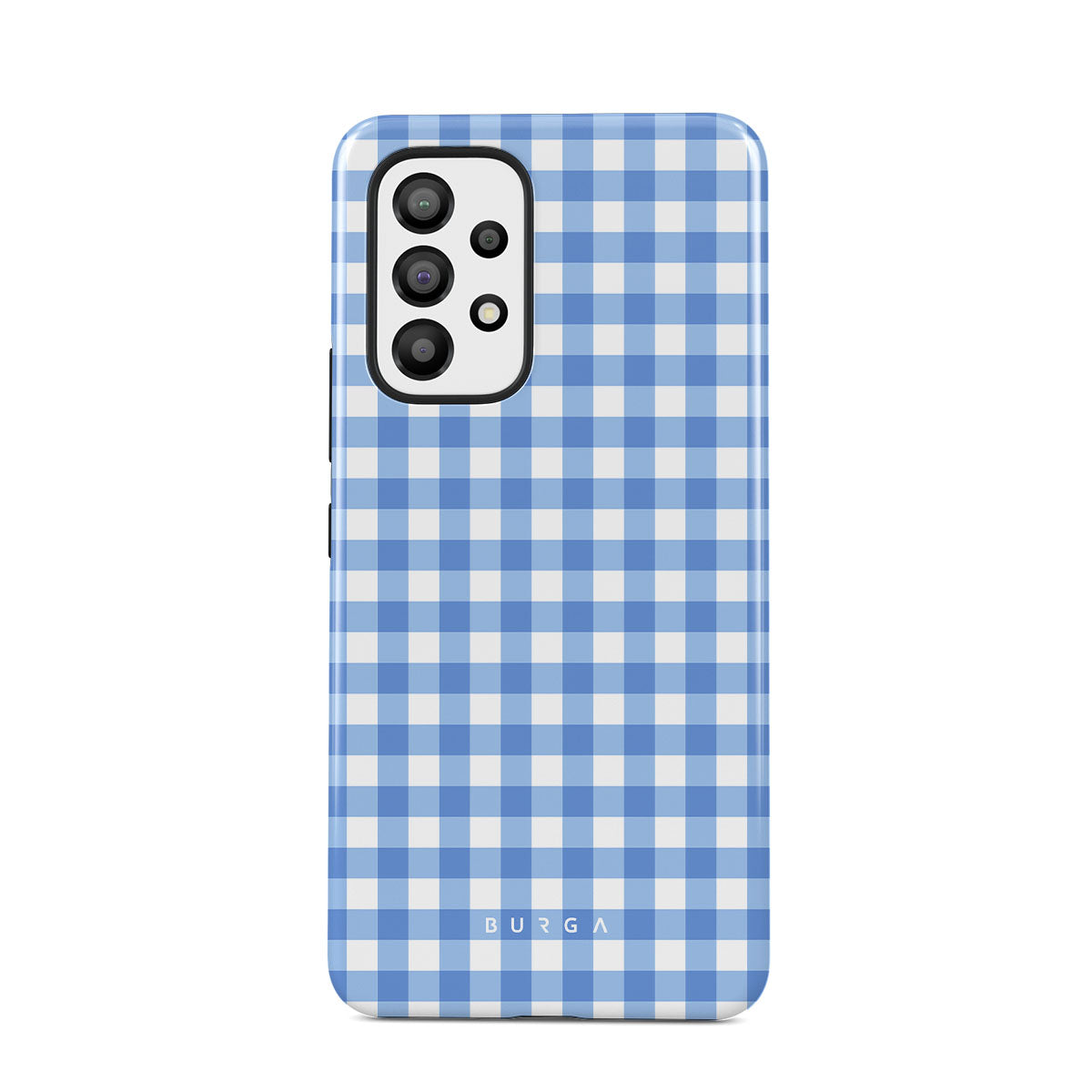Crisp blue checks are your invitation to lay on the grass, look up at the sky, and find shapes in the clouds—simple joys that make any day lovely. That’s our Lovely Day Samsung Galaxy A73 phone case design.