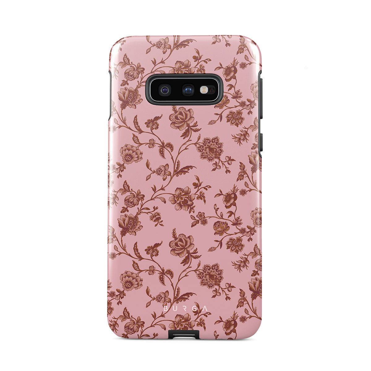 The Lover Samsung Galaxy S10E phone case design: because you're a Lover, not a fighter. Delicate floral motifs across a soft pink background capture the essence of timeless beauty and rustic elegance. Perfect for modern-day cowgirls with a vintage heart.