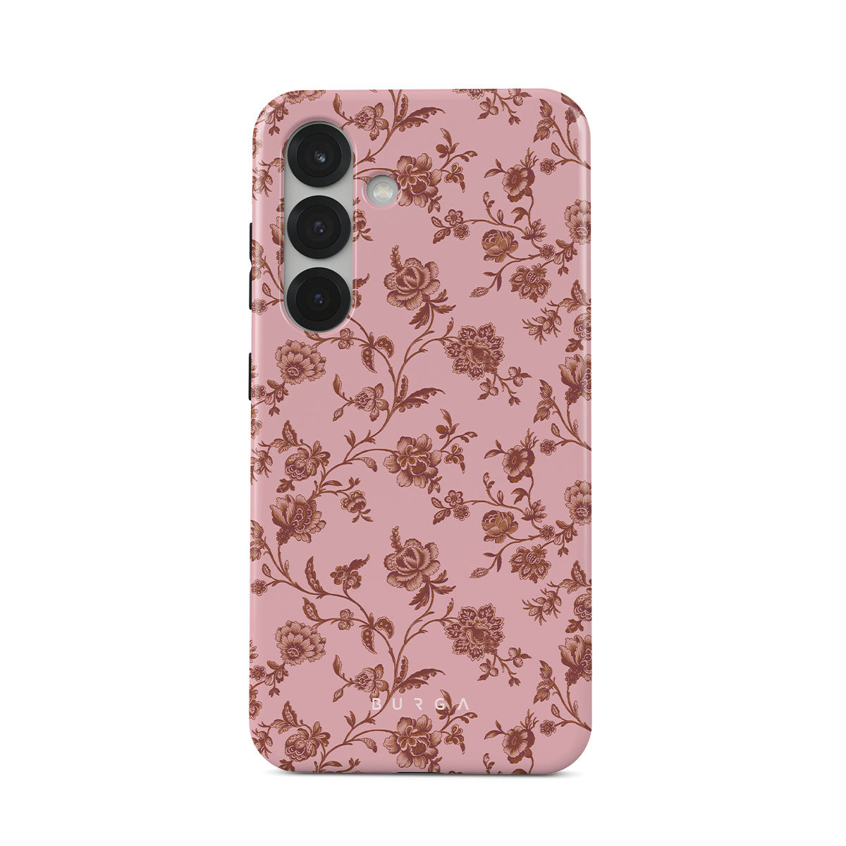 The Lover Samsung Galaxy S25 phone case design: because you're a Lover, not a fighter. Delicate floral motifs across a soft pink background capture the essence of timeless beauty and rustic elegance. Perfect for modern-day cowgirls with a vintage heart.