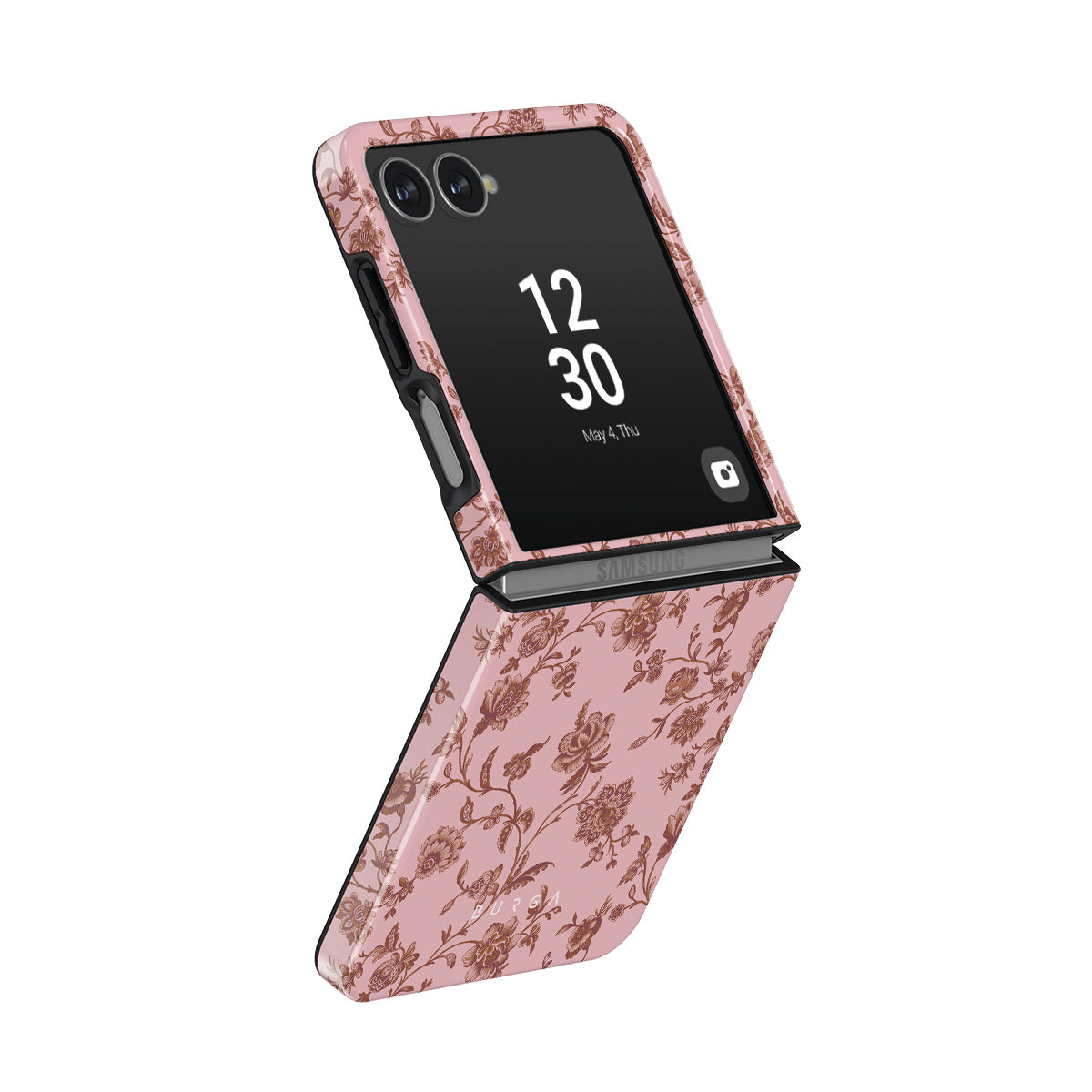 The Lover Samsung Galaxy Z Flip 7 phone case design: because you're a Lover, not a fighter. Delicate floral motifs across a soft pink background capture the essence of timeless beauty and rustic elegance. Perfect for modern-day cowgirls with a vintage heart.