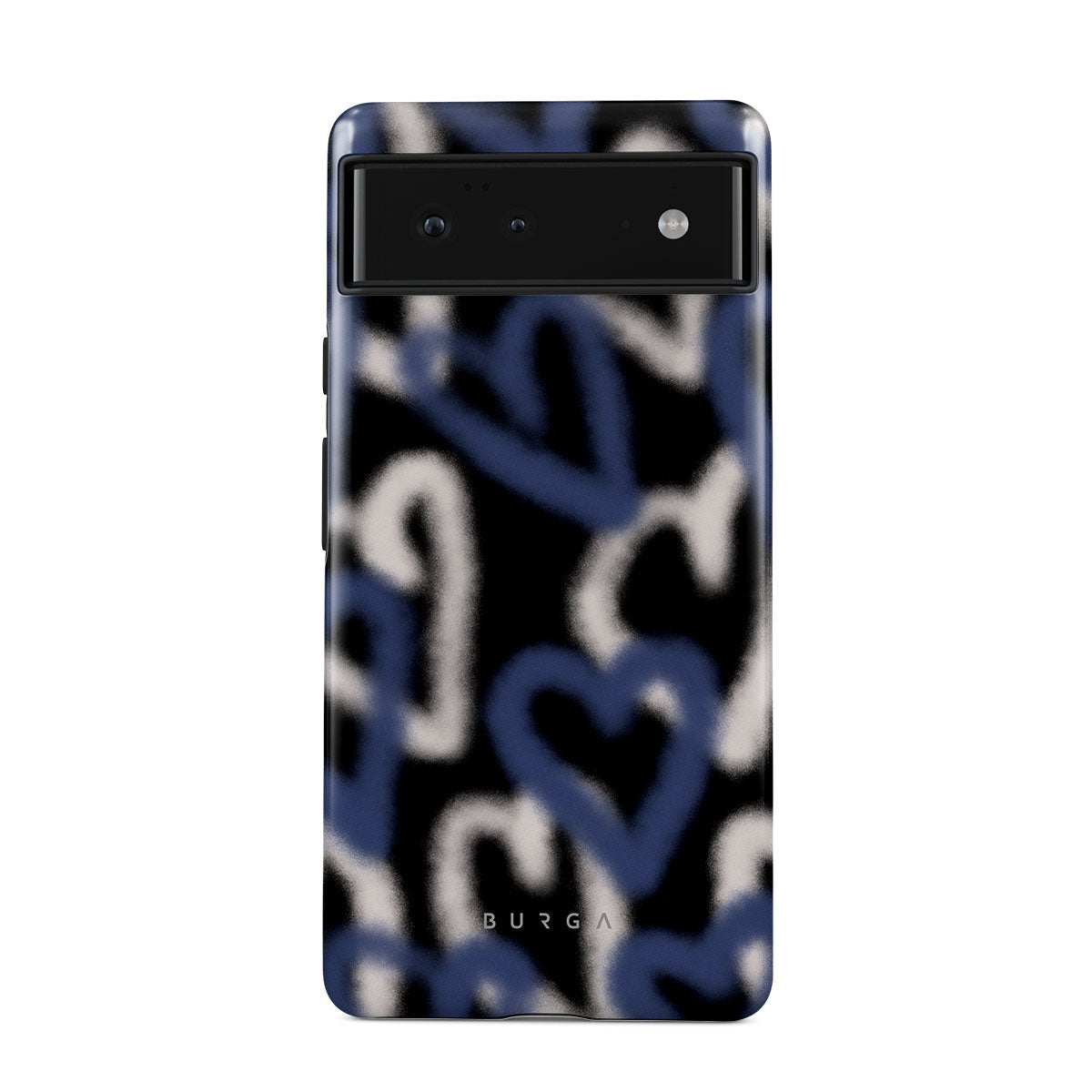 The Lucky You Google Pixel 6 phone case captures the raw, unfiltered pulse of street art. Graffiti hearts in striking blue and white stand out against a black background, their edges softly faded. It’s a design that speaks to the restless who find beauty in chaos and dare to be different.