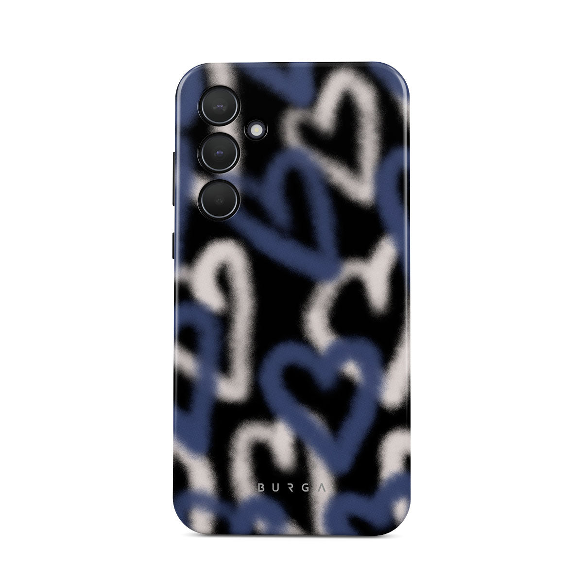 The Lucky You Samsung Galaxy A35 phone case captures the raw, unfiltered pulse of street art. Graffiti hearts in striking blue and white stand out against a black background, their edges softly faded. It’s a design that speaks to the restless who find beauty in chaos and dare to be different.