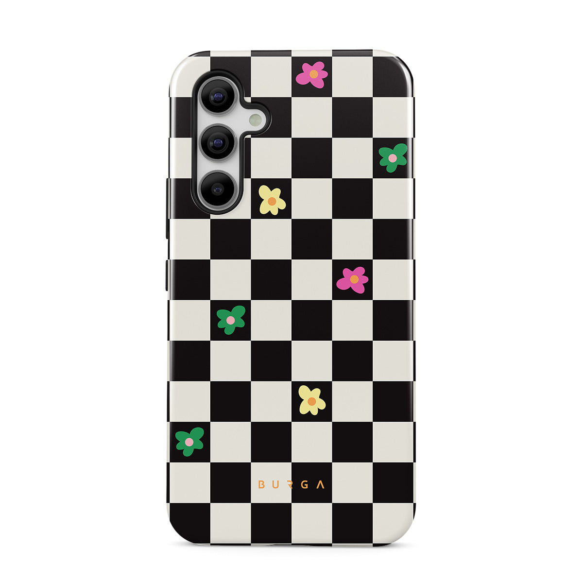 Take time to relax with our Lunch Break - Samsung Galaxy A55 phone case. The playful addition of colorful retro flowers to the classical black and white checkered pattern will add that extra pop of color. It will bring that much-needed *oomph* to your phone. With this playful design, you can keep your phone cute and protected!