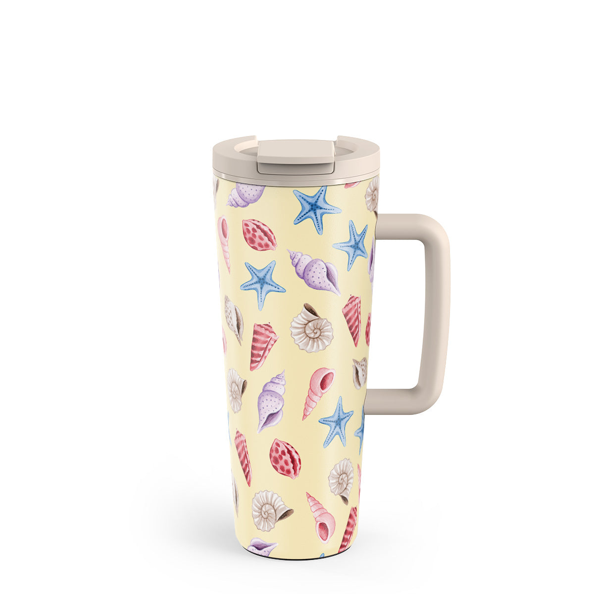 This design features: seashells, starfish, pastel yellow background, ocean theme