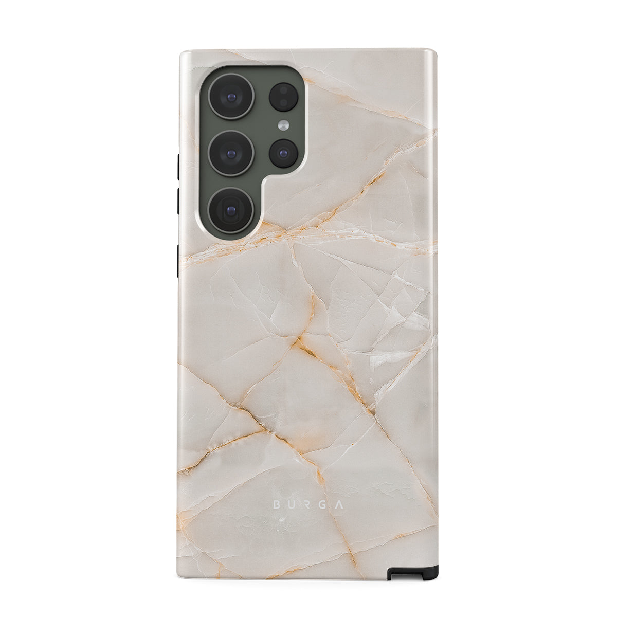 The Vanilla Sand Marble Samsung Galaxy S23 Ultra phone case cover features a marble design with creamy canvas showcasing beautiful golden hues. The soft-toned case will add a touch of luxury to the device while protecting it from dangerous falls.