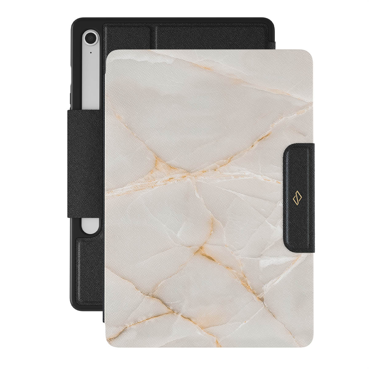 The Vanilla Sand Marble Samsung Galaxy Tab S10 FE folio case cover features a marble design with creamy canvas showcasing beautiful golden hues. The soft-toned case will add a touch of luxury to the device while protecting it from dangerous falls.