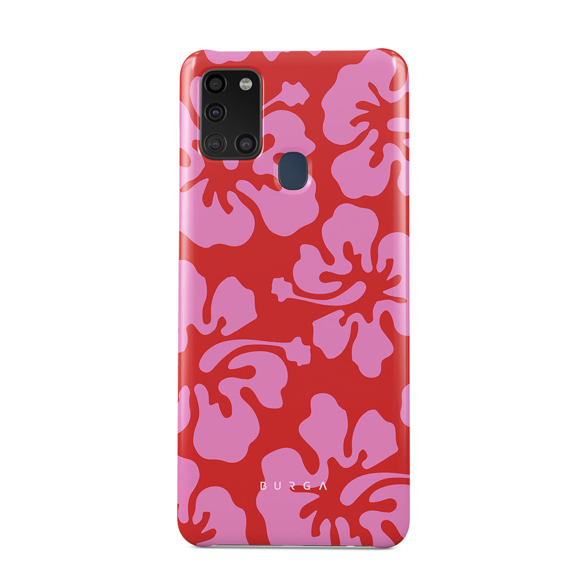 Dive into a sea of floral fantasy with Me Gustas Tu. Featuring oversized coral-toned blooms against a fiery backdrop, this Samsung Galaxy A21s 4G phone case design captures the wild heart of tropical flowers—perfect for those who want to carry a touch of exotic flair.