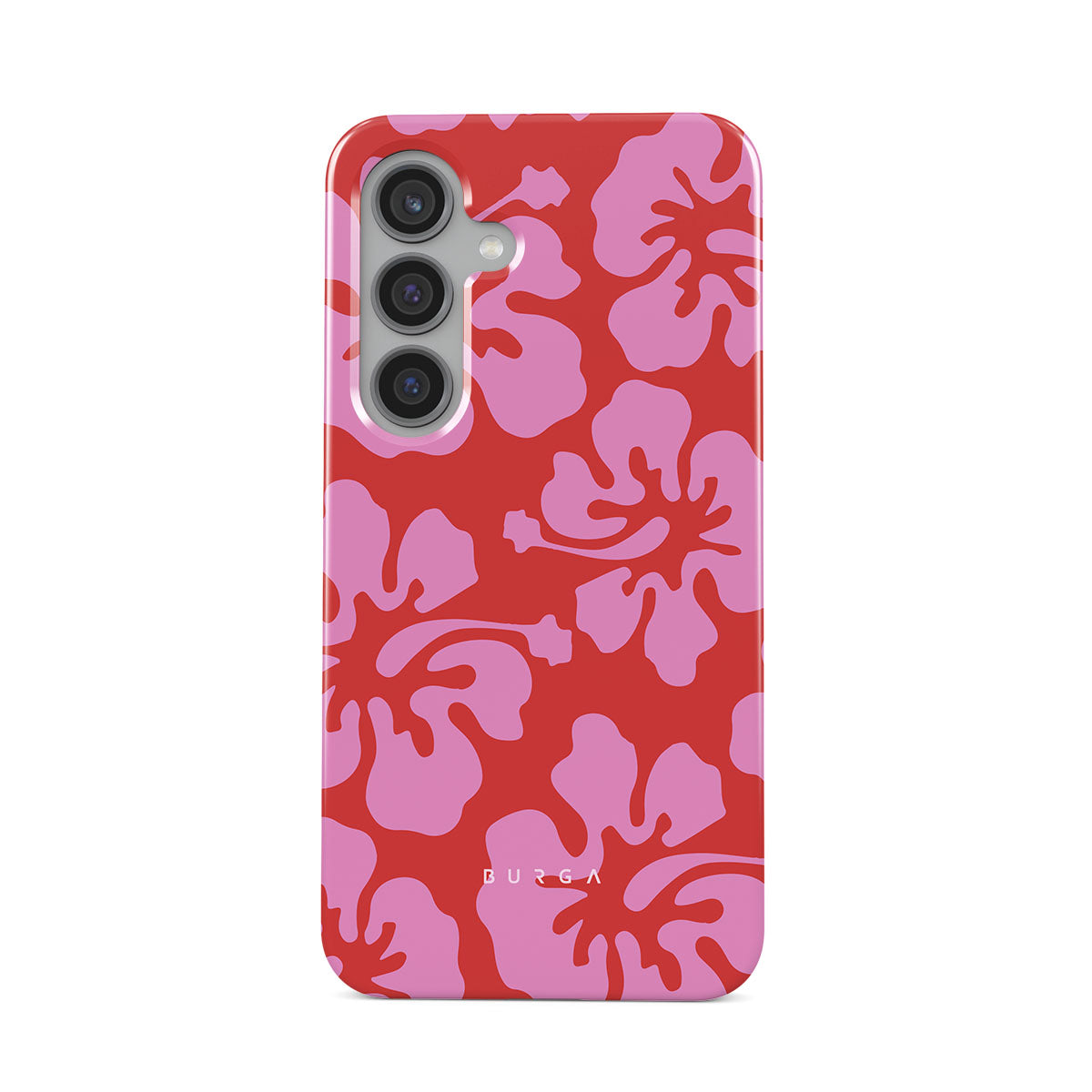 Dive into a sea of floral fantasy with Me Gustas Tu. Featuring oversized coral-toned blooms against a fiery backdrop, this Samsung Galaxy S24 FE phone case design captures the wild heart of tropical flowers—perfect for those who want to carry a touch of exotic flair.