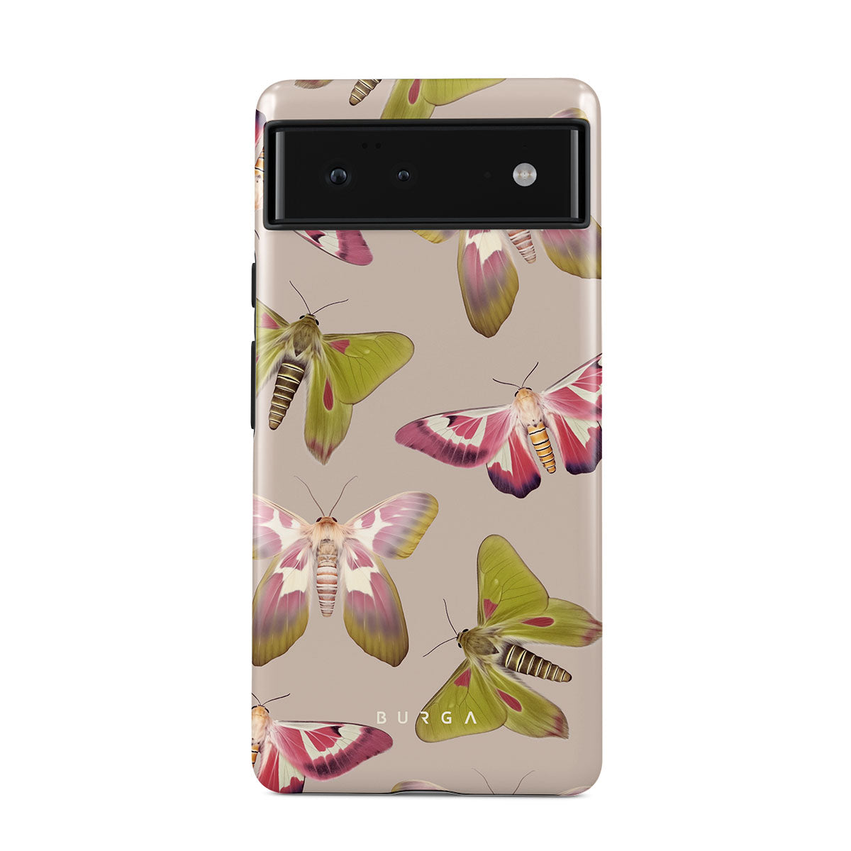 A tapestry of muted-toned moths — their wing patterns echoing tales of transformation and resilience found in nature's delicate beings. These moths, wings wide, serve as silent mentors, teaching us that every phase of life and change holds its own magic and mystery. Discover our Metamorphosis Google Pixel 6a phone casedesign.