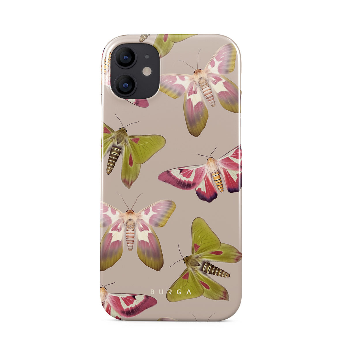 A tapestry of muted-toned moths — their wing patterns echoing tales of transformation and resilience found in nature's delicate beings. These moths, wings wide, serve as silent mentors, teaching us that every phase of life and change holds its own magic and mystery. Discover our Metamorphosis iPhone 12 Mini phone casedesign.