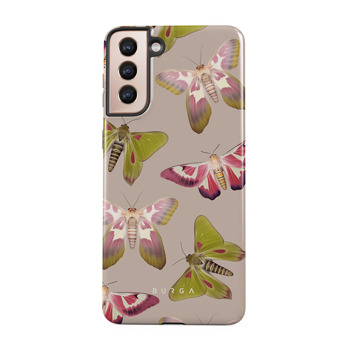 A tapestry of muted-toned moths — their wing patterns echoing tales of transformation and resilience found in nature's delicate beings. These moths, wings wide, serve as silent mentors, teaching us that every phase of life and change holds its own magic and mystery. Discover our Metamorphosis Samsung Galaxy S21 Plus phone casedesign.