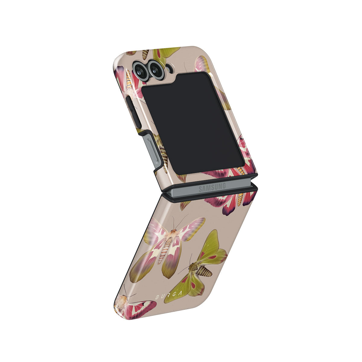 A tapestry of muted-toned moths — their wing patterns echoing tales of transformation and resilience found in nature's delicate beings. These moths, wings wide, serve as silent mentors, teaching us that every phase of life and change holds its own magic and mystery. Discover our Metamorphosis Samsung Galaxy Z Flip 6 phone casedesign.