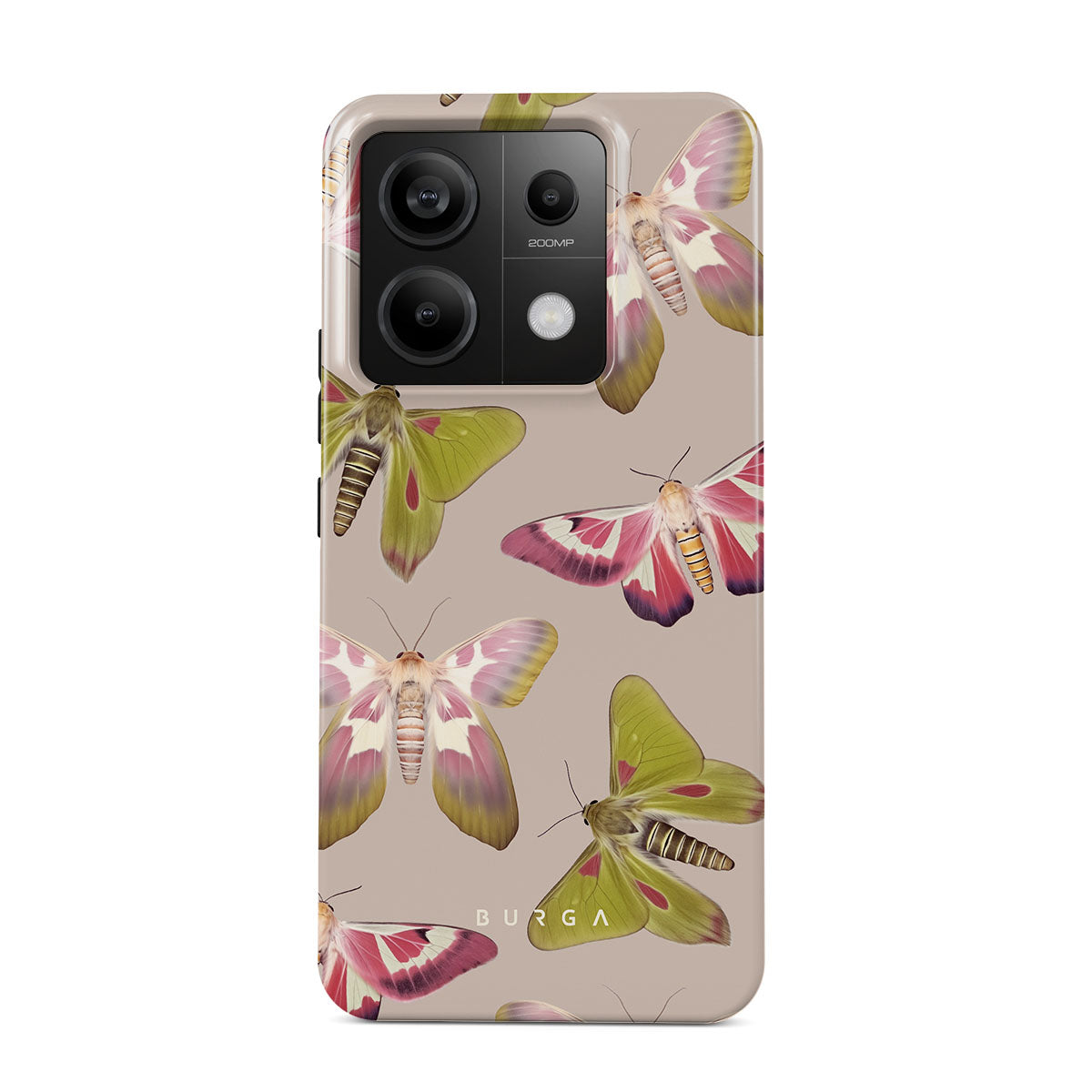 A tapestry of muted-toned moths — their wing patterns echoing tales of transformation and resilience found in nature's delicate beings. These moths, wings wide, serve as silent mentors, teaching us that every phase of life and change holds its own magic and mystery. Discover our Metamorphosis Xiaomi Redmi Note 13 Pro 5G phone casedesign.