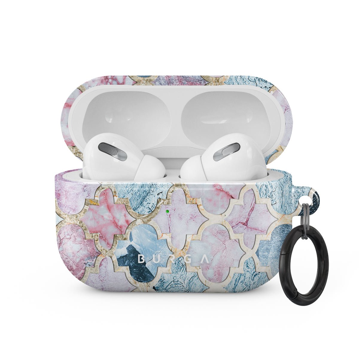 Feel closer to Morocco with our Apple Airpods Pro case cover with the Moroccan tiles' mosaic pattern. The time of choosing a dull protective cover instead of a pretty one has already passed. Protect your AirPods in style. Our case fits perfectly snug around Apple Airpods Pro . “Like a glove!” one might say. And it won’t disrupt the wireless charging capabilities of the newer model. There’s even an LED light indicator to prove it (don’t worry, wired charging still works, too). When fitted, the BURGA case will protect the delicate Apple Airpods Pro case beneath it from scratches, bumps, and drops while remaining scratch-free itself. Our signature design pattern prints are High Quality, and will never peel or fade away- thanks to our unique printing technology. And finally, a handy carabiner is there to make your life easier and more convenient: just snap it around your keys or belt loop and tackle the day head-on. Your music is right there by your side when you need it.