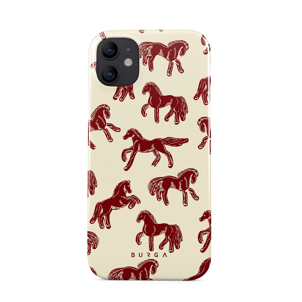 It's time to unleash your wild side with the Mustang design. Bold red horses gallop across a nude background, capturing the spirit of untamed adventure. This iPhone 12 Mini phone case is perfect for the free-spirited souls ready to ride into the unknown.