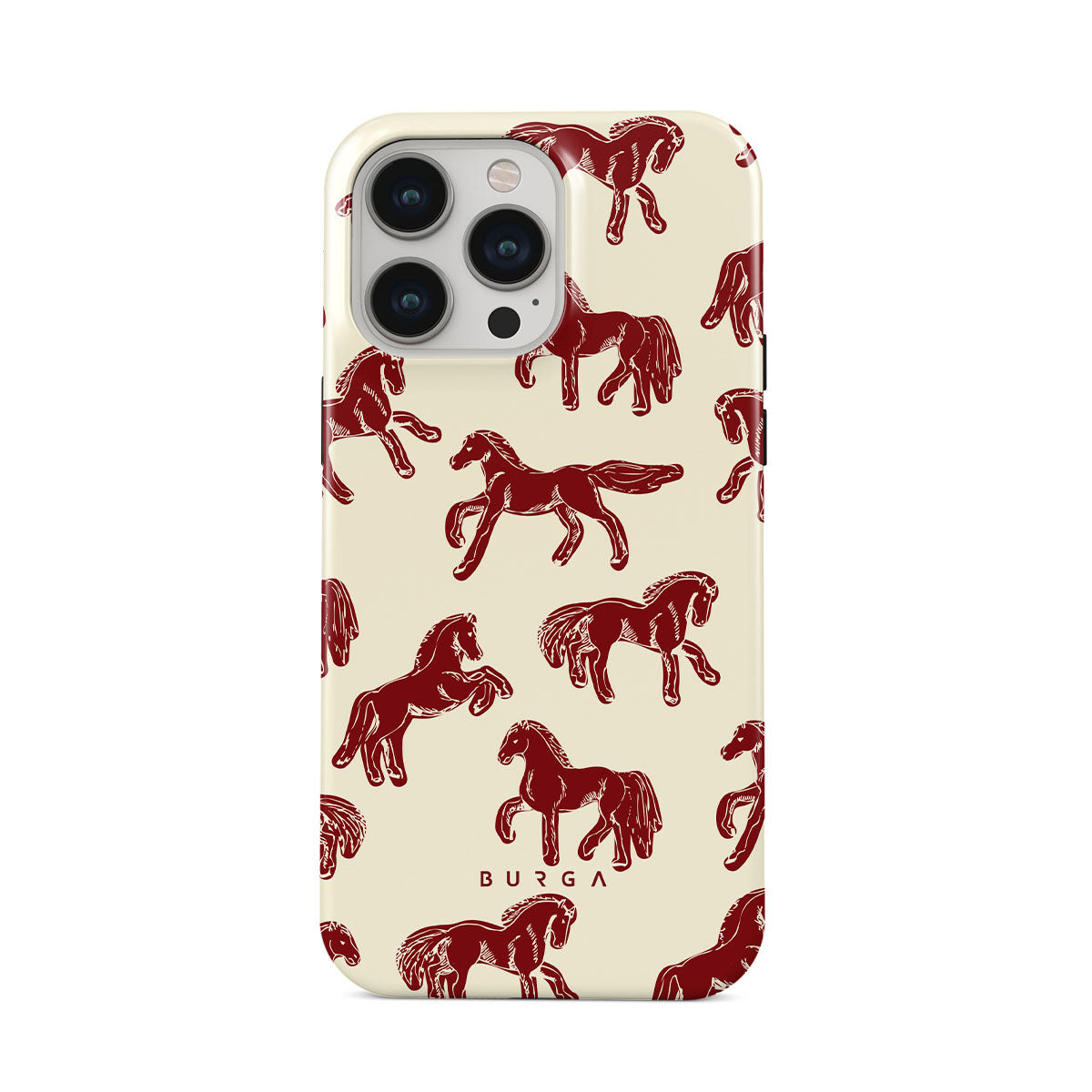 It's time to unleash your wild side with the Mustang design. Bold red horses gallop across a nude background, capturing the spirit of untamed adventure. This iPhone 14 Pro phone case is perfect for the free-spirited souls ready to ride into the unknown.